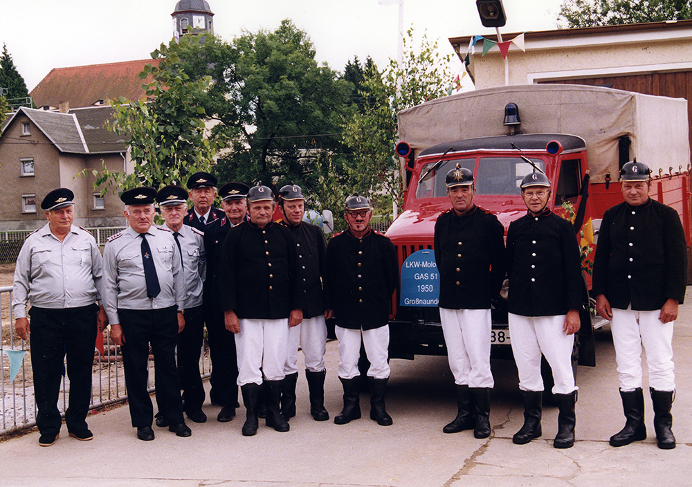 Das hier gezeigte Bild wurde im Juni 1999 zur 650-Jahrfeier von Großnaundorf aufgenommen. Zum Festumzug hatten wir historische Uniformen ausgeliehen. Im Hintergrund ist unser ehemaliges Feuerwehrauto, ein Molotow russischer Bauart, zu sehen. Das Fahrzeug wurde vor einigen Jahren durch die Jugendfeuerwehr überholt und erstrahlt seit her in neuem Glanz.