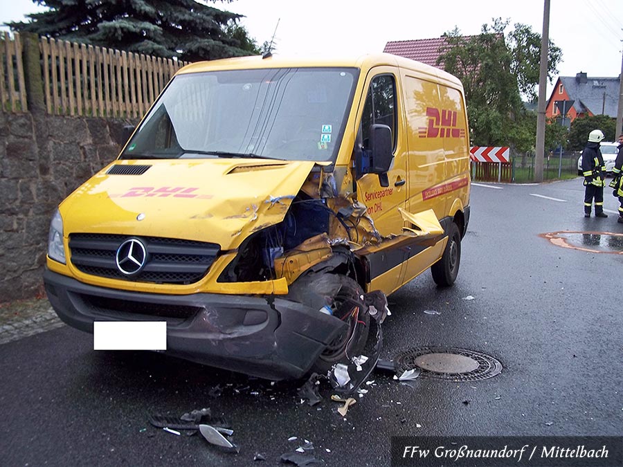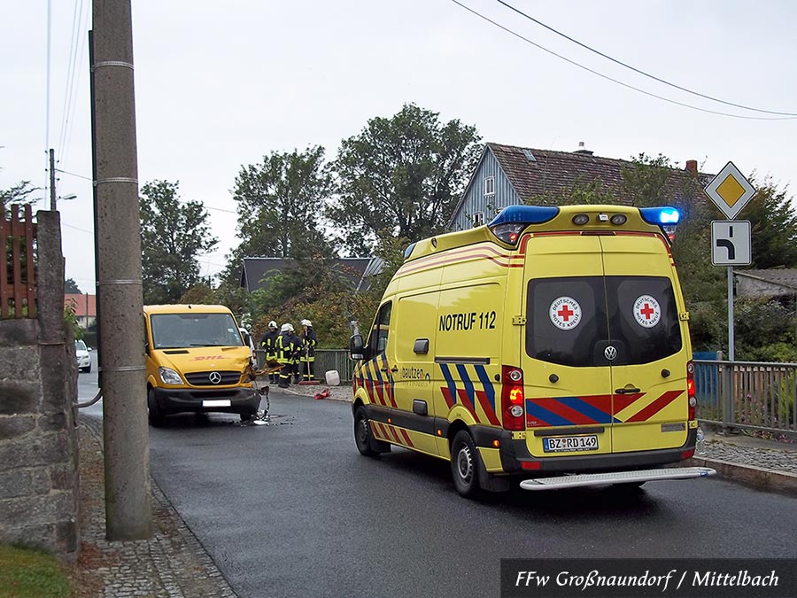 Ein Bäckerei- und ein Postfahrzeug kollidierten am Sonnabendmorgen in Großnaundorf auf der Lomnitzer Straße. Bei dem Unfall wurde eine Person schwer verletzt. Anwohner aus der Nachbarschaft der Unfallstelle leisteten sofortige Erste Hilfe, bemühten sich aktiv und rücksichtsvoll um die Versorgung der Verletzten. Auch der Unfallverursacher war sofort um Hilfe bemüht. Die Feuerwehren von Großnaundorf und Oberlichtenau rückten zum Unfall aus. Die Großnaundorfer Kameraden leisteten bis zum Eintreffen des Rettungsdienstes Erste Hilfe.