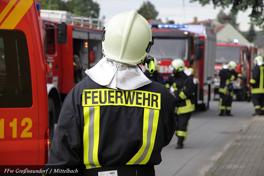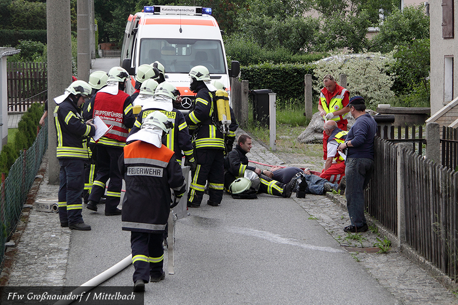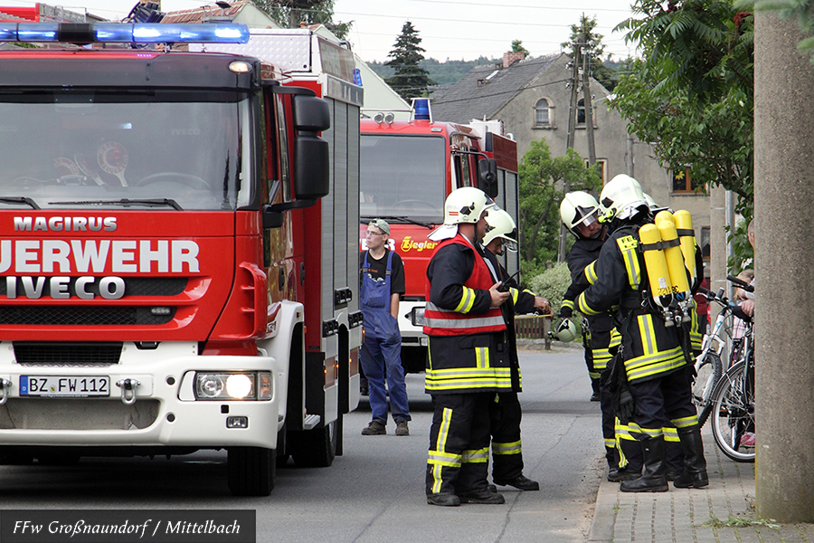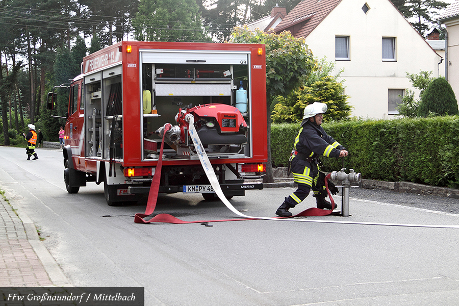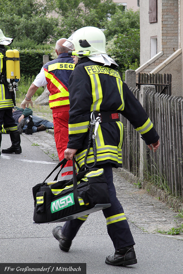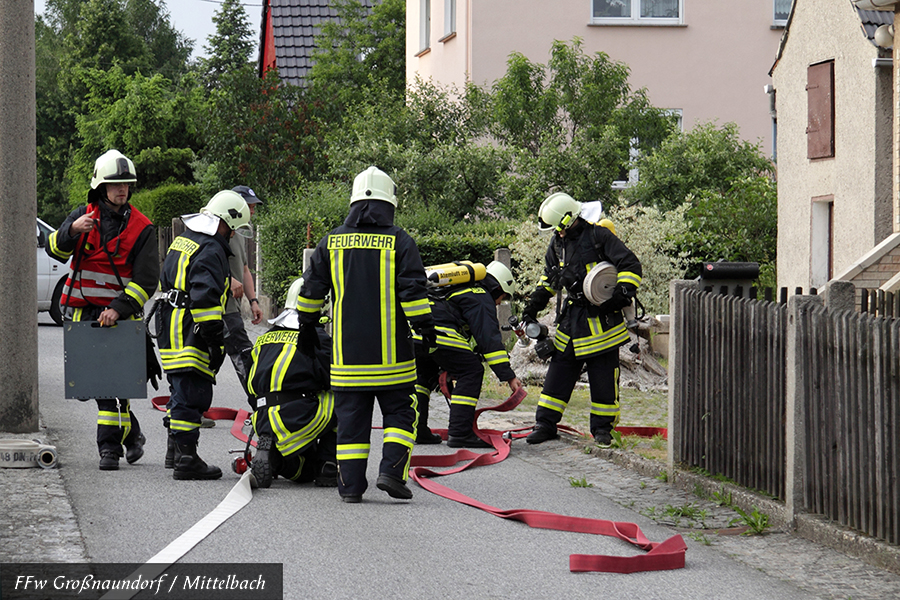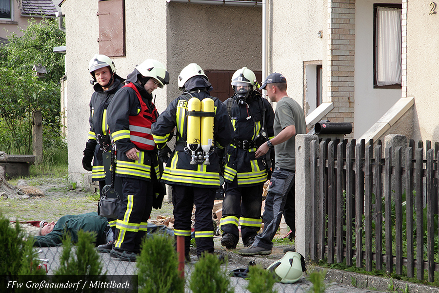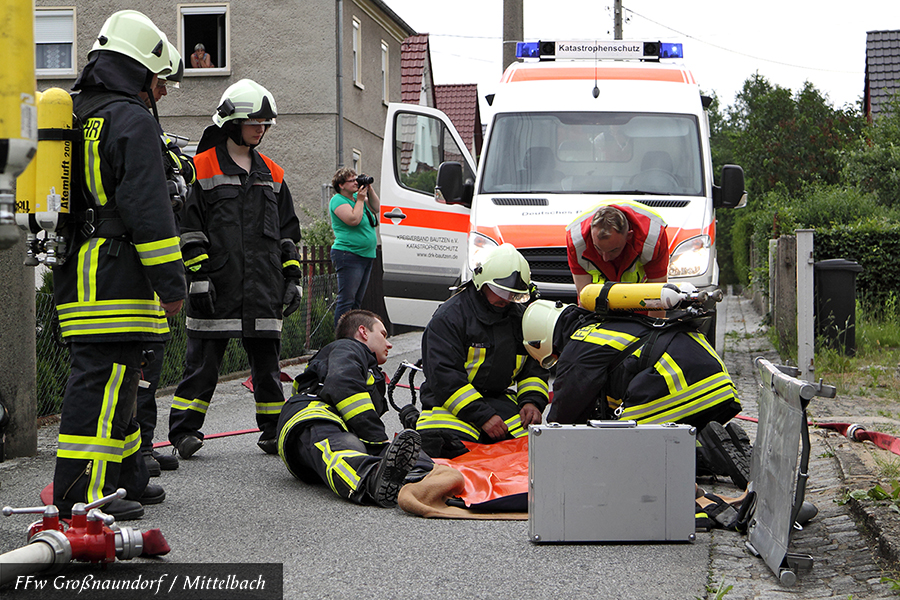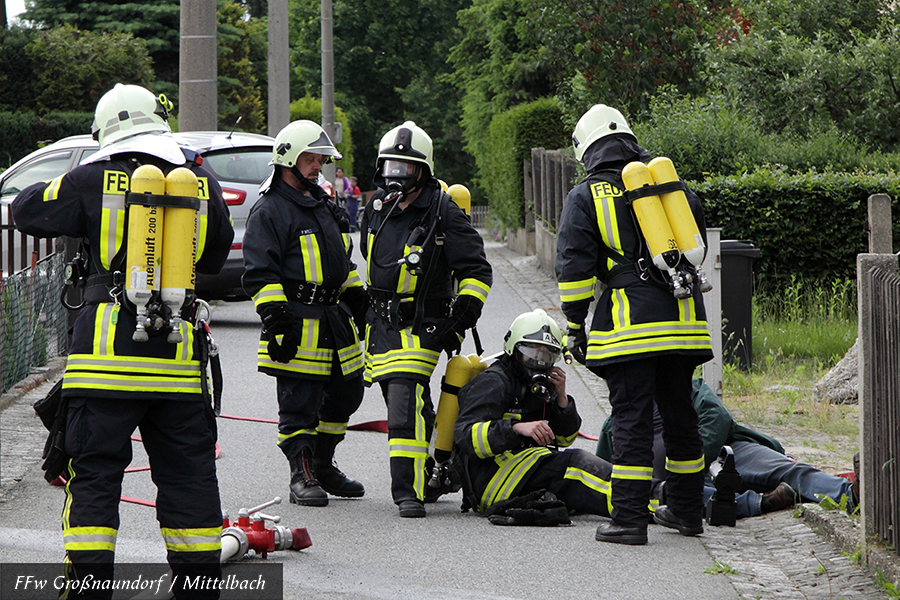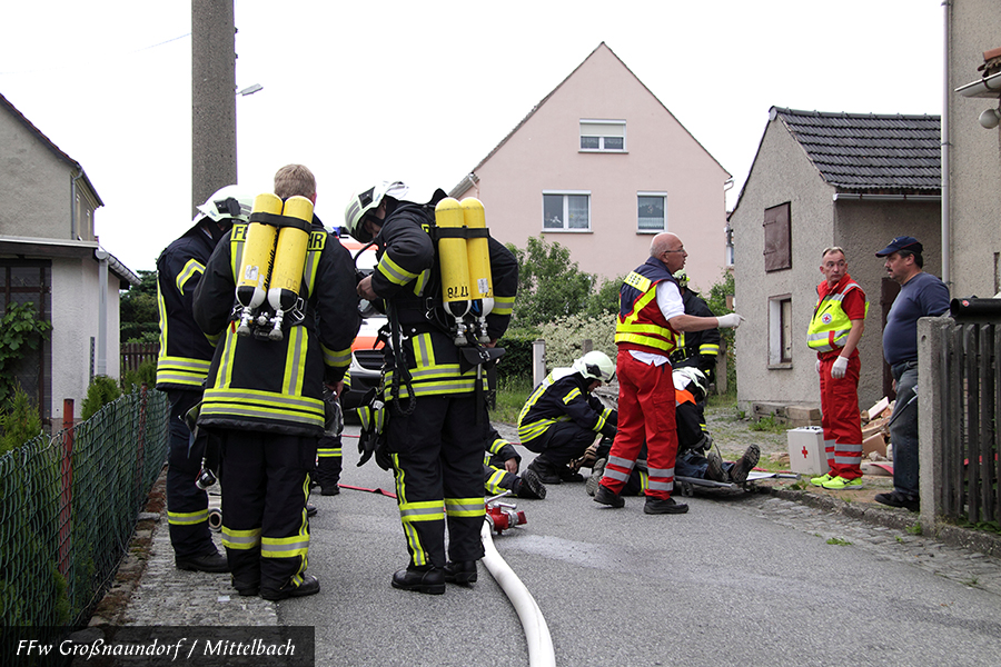 Alarm am 14.06.2013 um 19:23 Uhr für die Feuerwehr Großnaundorf. Die Meldung „Kellerbrand EFH Nordstraße 2“ ließ nichts Gutes erahnen. Nach 7 Minuten war die FFw Großnaundorf mit beiden Fahrzeugen und 9 Kameraden vor Ort. Nach kurzer Lageerkundung beim Hauseigentümer, der sagte das noch 2 Personen im Gebäude sind, ließ der Gruppenführer noch die FFw Lomnitz und die FFw Oberlichtenau nachalarmieren. Sofort wurde eine Wasserversorgung aufgebaut und ein Trupp machte sich zur Menschenrettung auf in den Keller des Gebäudes. Als der Trupp die Verletzte Person erreichte ereilte dem Einsatzleiter der Funkspruch „MAYDAY MAYDAY MAYDAY“. Das heißt der Trupp im Gebäude hat ein Problem und brauch dringend Hilfe. Sofort machte sich der Sicherheitstrupp auf ins Gebäude und rettete die Verletzte Person und den in Not geratenen Angriffstrupp. Die 2. Person im Gebäude machte sich im Dachgeschoss an einem Fenster bemerkbar. Diese wurde über die Steckleiter in Sicherheit gebracht. Die SEG Oberlichtenau kümmerte sich um alle 3 Verletzten Personen, darunter auch ein Feuerwehrkamerad. Das Feuer wurde gelöscht und somit konnte die Übung abgeschlossen werden.