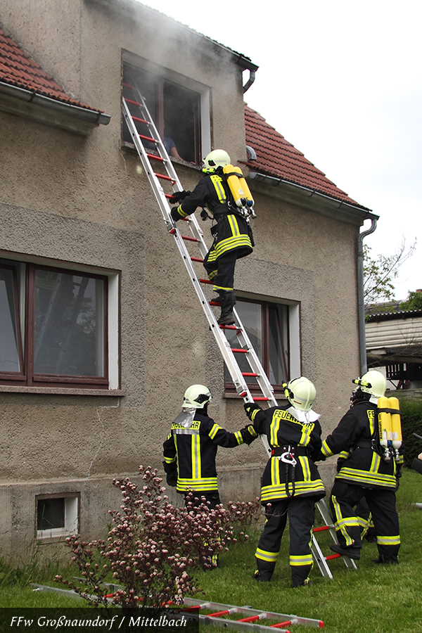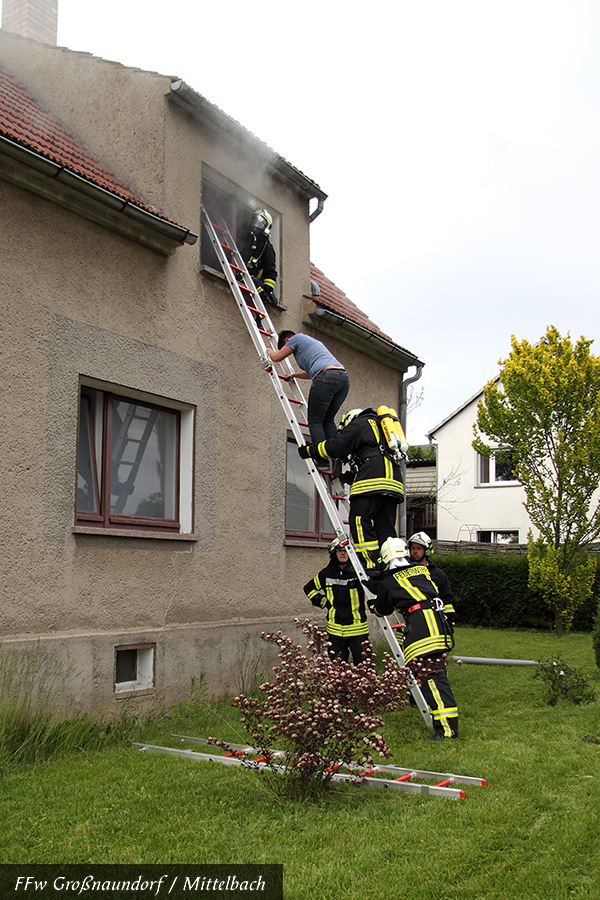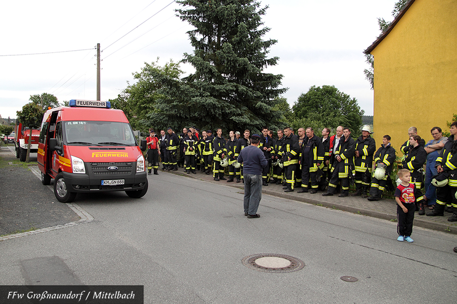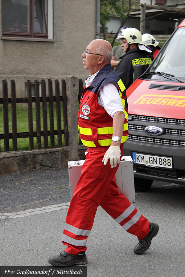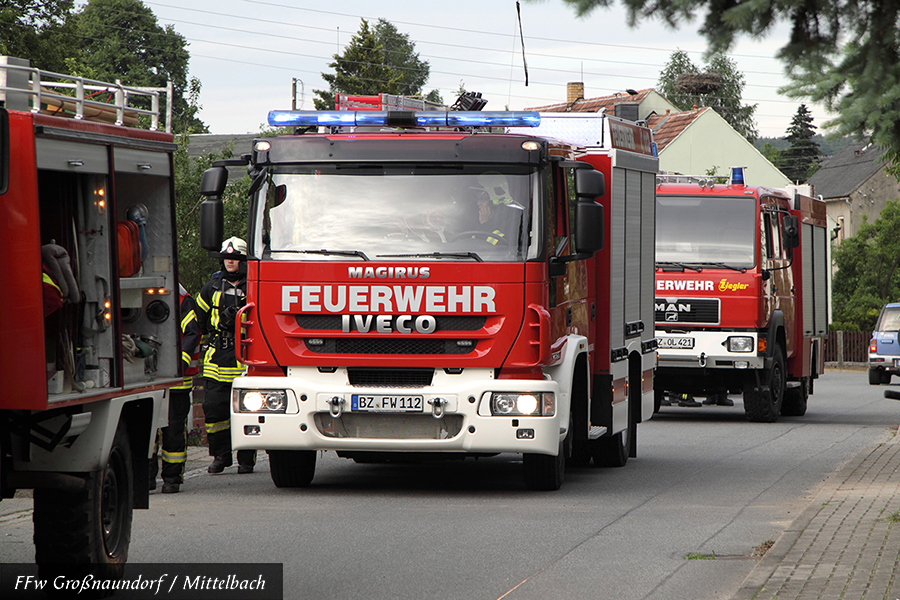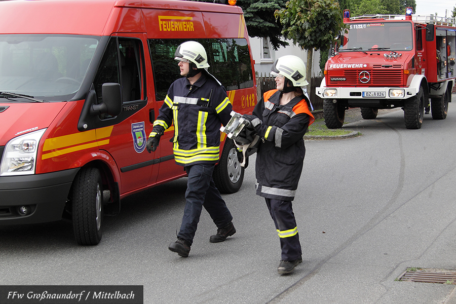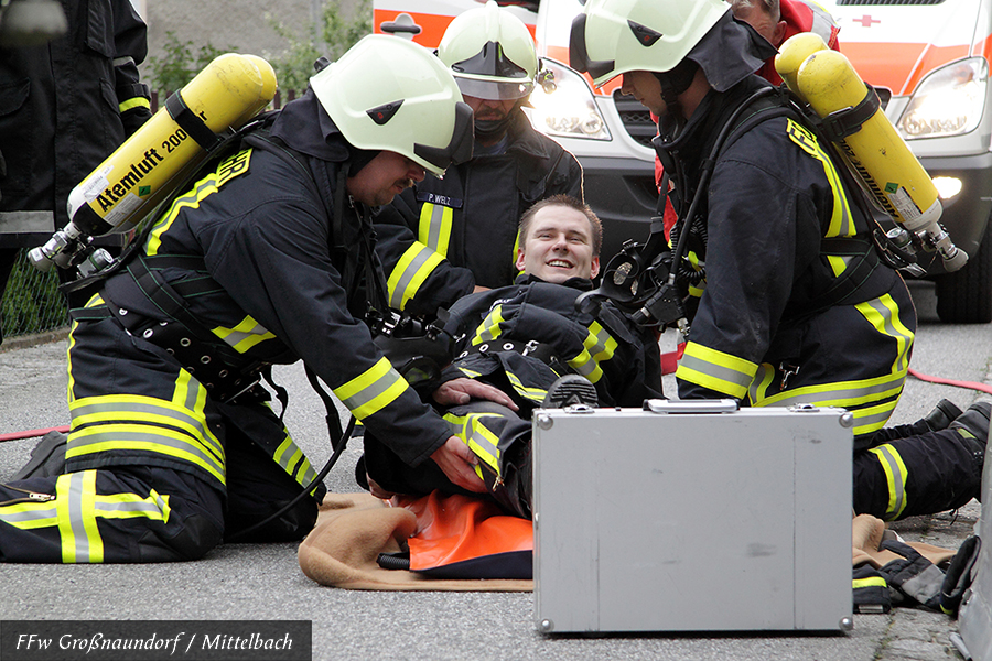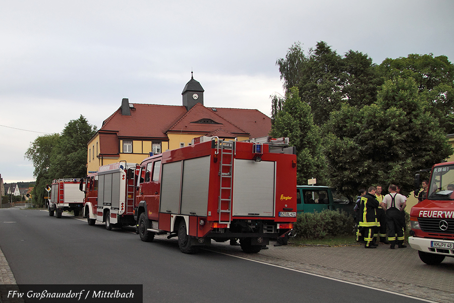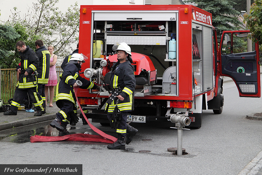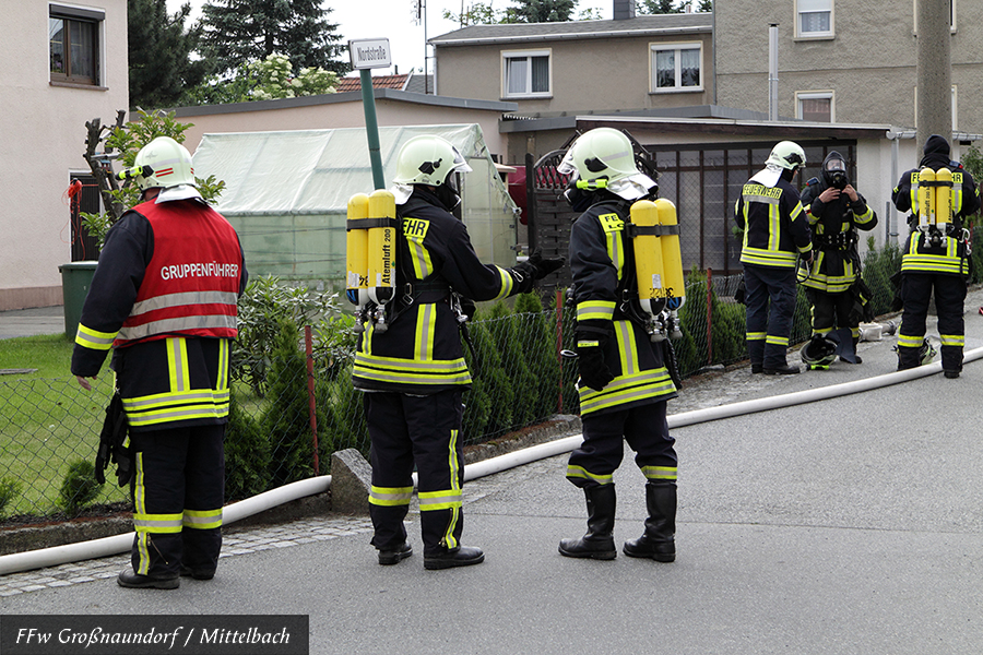 Alarm am 14.06.2013 um 19:23 Uhr für die Feuerwehr Großnaundorf. Die Meldung „Kellerbrand EFH Nordstraße 2“ ließ nichts Gutes erahnen. Nach 7 Minuten war die FFw Großnaundorf mit beiden Fahrzeugen und 9 Kameraden vor Ort. Nach kurzer Lageerkundung beim Hauseigentümer, der sagte das noch 2 Personen im Gebäude sind, ließ der Gruppenführer noch die FFw Lomnitz und die FFw Oberlichtenau nachalarmieren. Sofort wurde eine Wasserversorgung aufgebaut und ein Trupp machte sich zur Menschenrettung auf in den Keller des Gebäudes. Als der Trupp die Verletzte Person erreichte ereilte dem Einsatzleiter der Funkspruch „MAYDAY MAYDAY MAYDAY“. Das heißt der Trupp im Gebäude hat ein Problem und brauch dringend Hilfe. Sofort machte sich der Sicherheitstrupp auf ins Gebäude und rettete die Verletzte Person und den in Not geratenen Angriffstrupp. Die 2. Person im Gebäude machte sich im Dachgeschoss an einem Fenster bemerkbar. Diese wurde über die Steckleiter in Sicherheit gebracht. Die SEG Oberlichtenau kümmerte sich um alle 3 Verletzten Personen, darunter auch ein Feuerwehrkamerad. Das Feuer wurde gelöscht und somit konnte die Übung abgeschlossen werden.