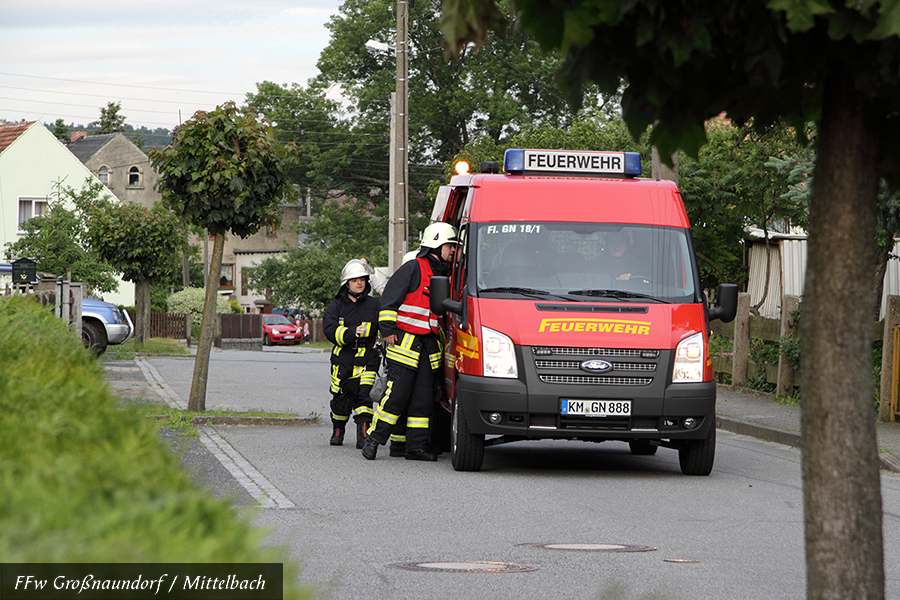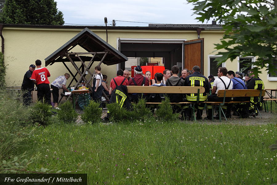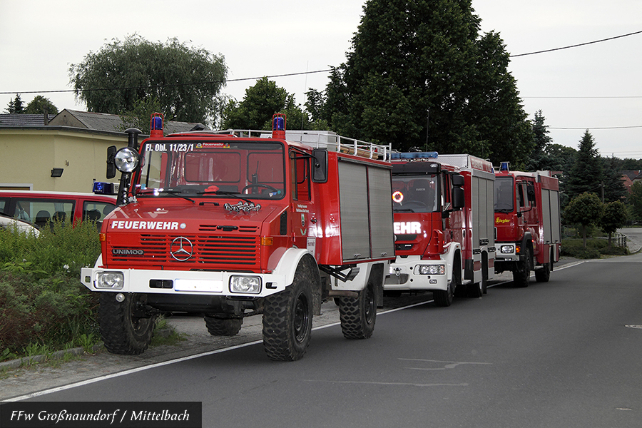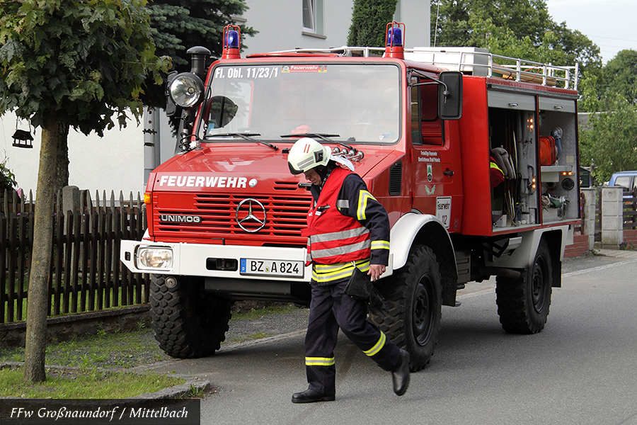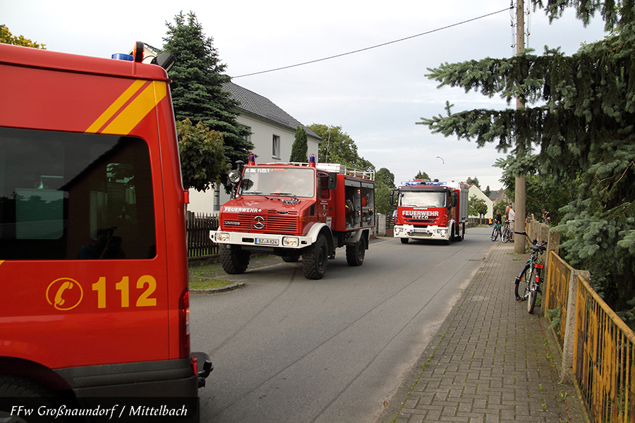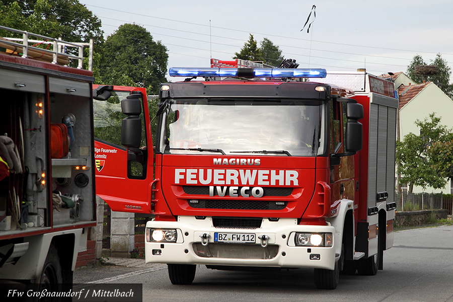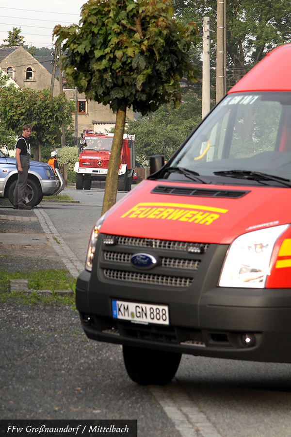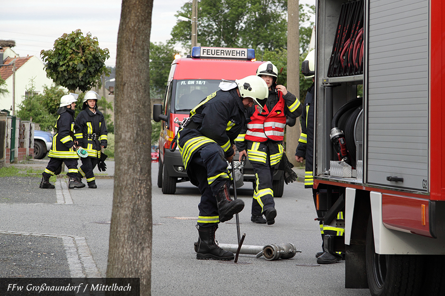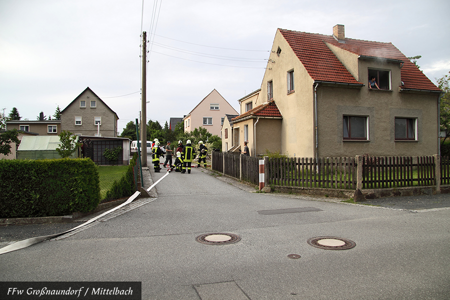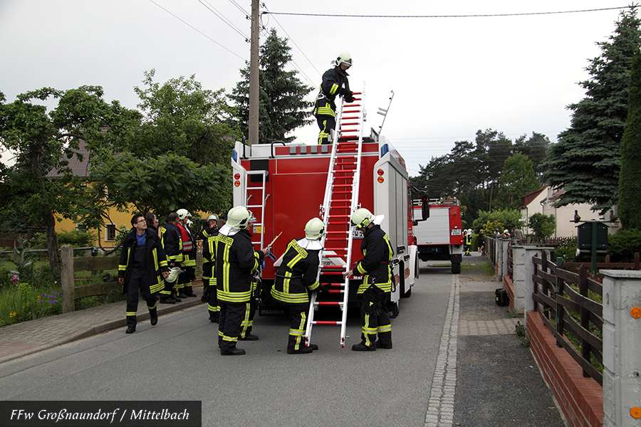 Alarm am 14.06.2013 um 19:23 Uhr für die Feuerwehr Großnaundorf. Die Meldung „Kellerbrand EFH Nordstraße 2“ ließ nichts Gutes erahnen. Nach 7 Minuten war die FFw Großnaundorf mit beiden Fahrzeugen und 9 Kameraden vor Ort. Nach kurzer Lageerkundung beim Hauseigentümer, der sagte das noch 2 Personen im Gebäude sind, ließ der Gruppenführer noch die FFw Lomnitz und die FFw Oberlichtenau nachalarmieren. Sofort wurde eine Wasserversorgung aufgebaut und ein Trupp machte sich zur Menschenrettung auf in den Keller des Gebäudes. Als der Trupp die Verletzte Person erreichte ereilte dem Einsatzleiter der Funkspruch „MAYDAY MAYDAY MAYDAY“. Das heißt der Trupp im Gebäude hat ein Problem und brauch dringend Hilfe. Sofort machte sich der Sicherheitstrupp auf ins Gebäude und rettete die Verletzte Person und den in Not geratenen Angriffstrupp. Die 2. Person im Gebäude machte sich im Dachgeschoss an einem Fenster bemerkbar. Diese wurde über die Steckleiter in Sicherheit gebracht. Die SEG Oberlichtenau kümmerte sich um alle 3 Verletzten Personen, darunter auch ein Feuerwehrkamerad. Das Feuer wurde gelöscht und somit konnte die Übung abgeschlossen werden.