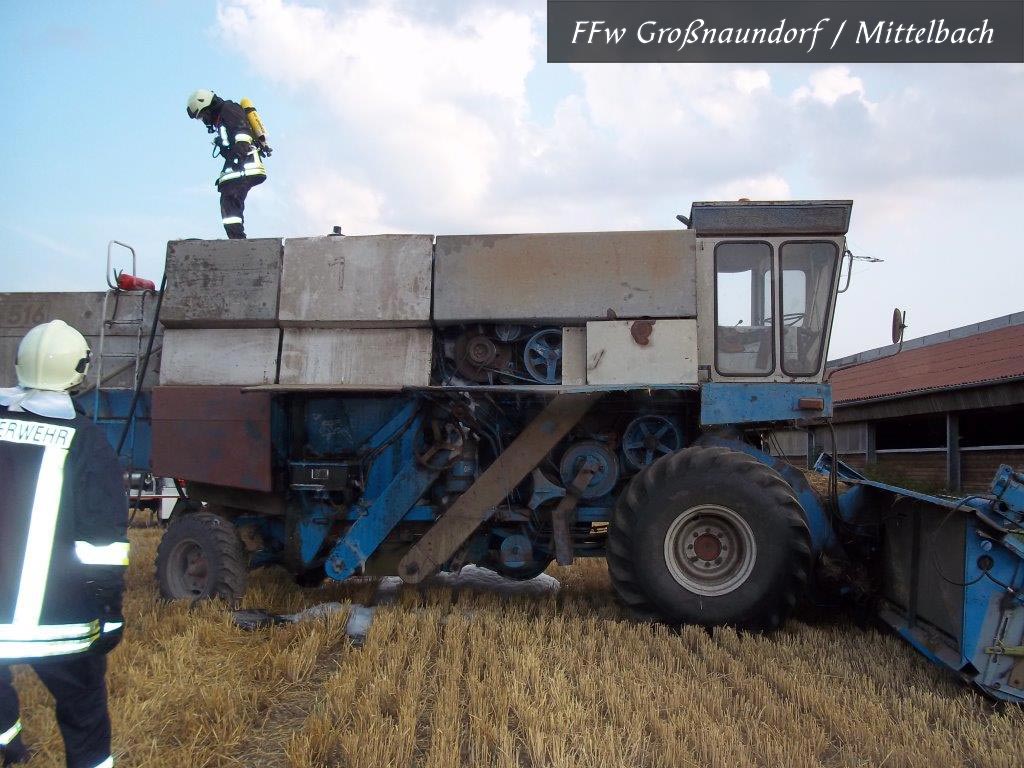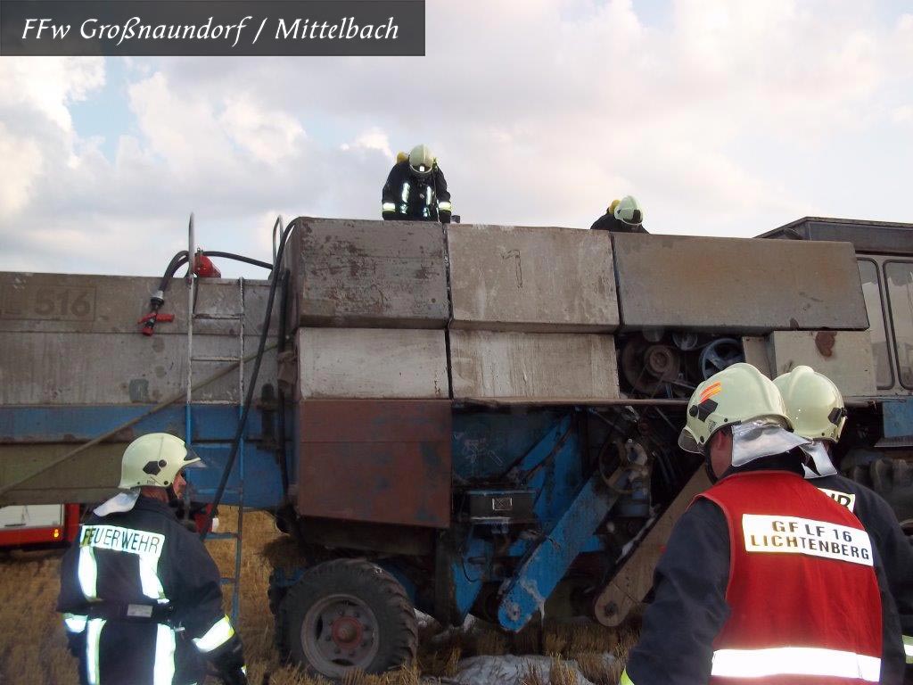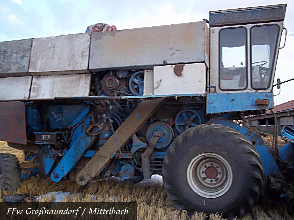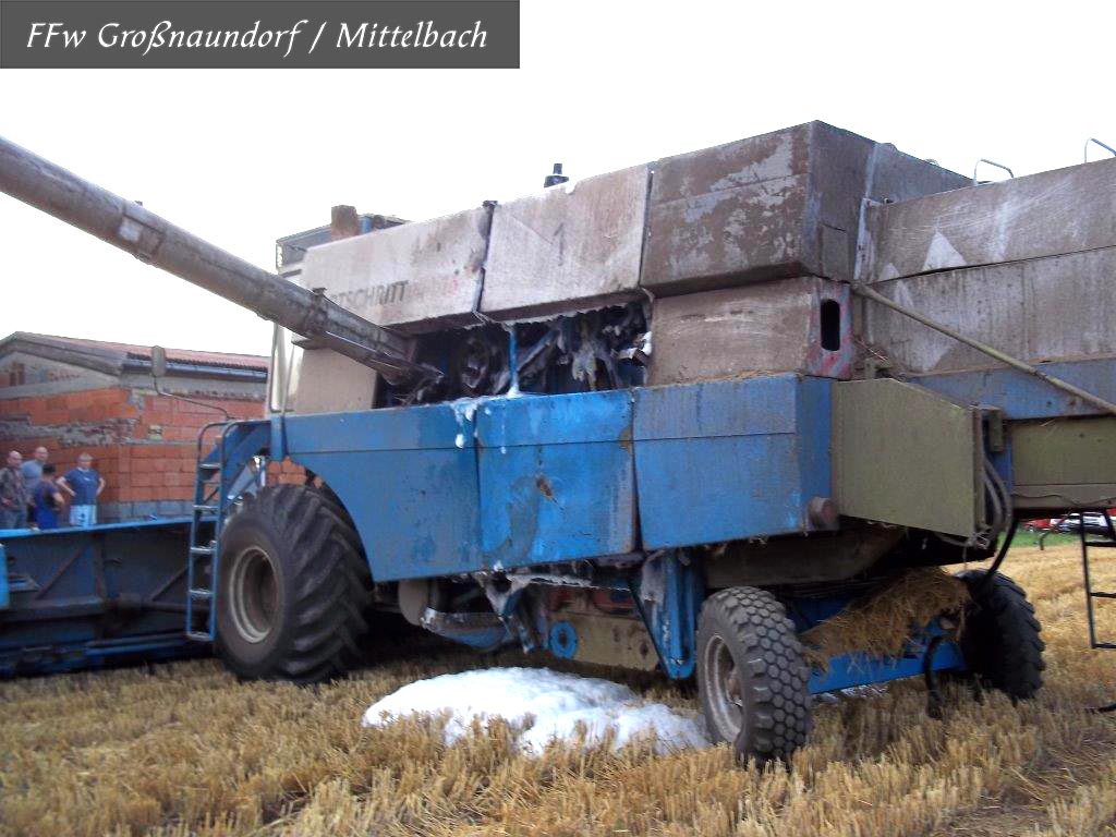 Wir wurden zu einem in Vollbrand stehenden Mähdrescher auf einem Feld in Großnaundorf alarmiert. An der Einsatzstelle bestätigte sich die Meldung allerdings nicht. Lediglich im Motorraum brannte es. Zusammen mit der FFw Lichtenberg stellten wir einen Angriffstrupp der das Feuer mit Wasser und Schaum löschte.