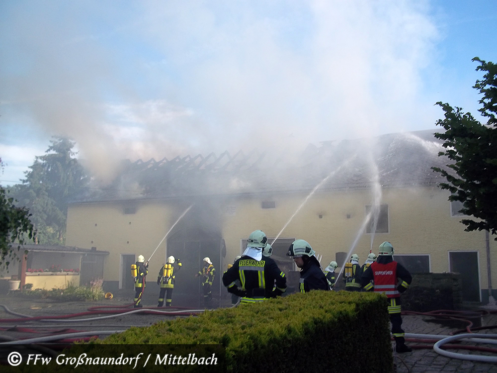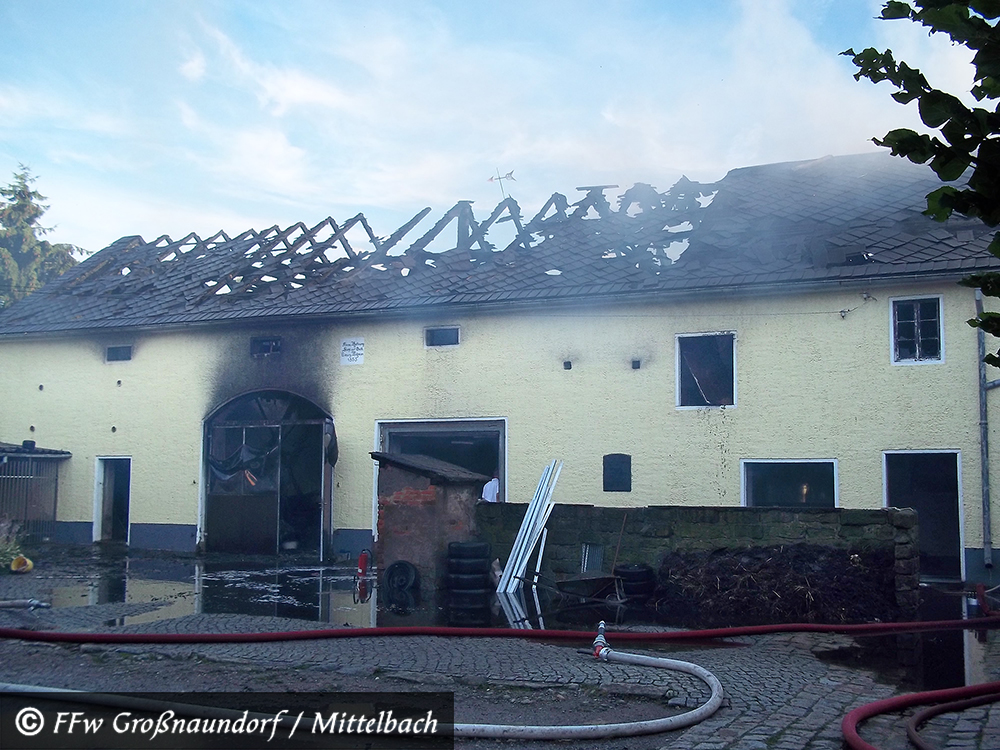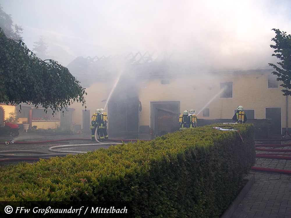 Wir wurden zu einem Großbrand in die Nachbargemeinde nachgefordert. Am Einsatzort angekommen stand eine Scheune die als Werkstatt benutzt wird in Vollbrand. Umgehend rüsteten sich 2 Trupps von uns mit Atemschutz aus und unterstützten die Löscharbeiten. Als das Feuer von außen soweit abgelöscht war ging ein Trupp von uns zum Innenangriff ins Gebäude. Insgesamt stellten wir 5 Atemschutzgeräteträger zur Verfügung. Nach gut 3,5 Stunden konnten wir diesen Einsatz beenden.