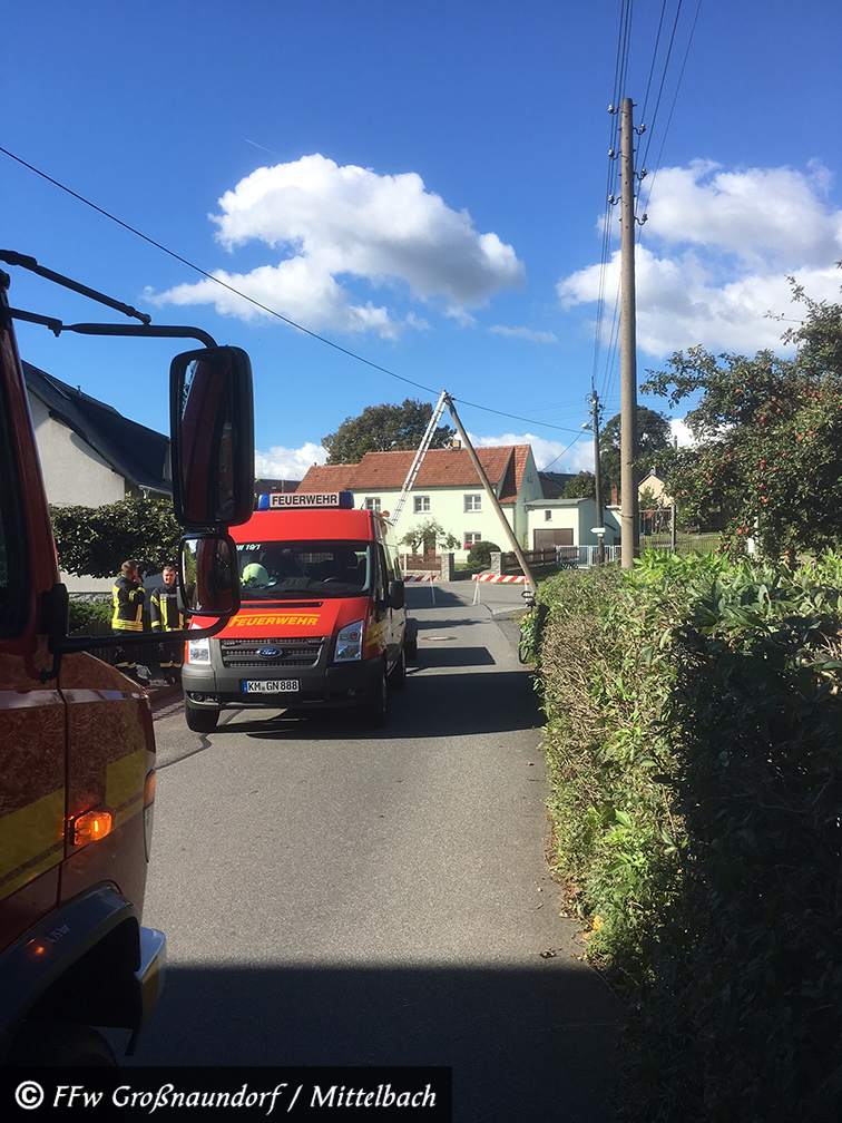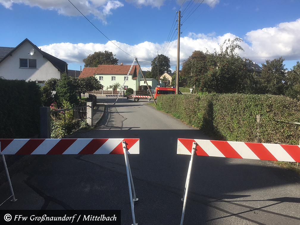 Auf der Lomnitzer Straße ist ein Telefonmast aufgrund Altersschwäche gebrochen und hing nur noch am Kabel über der Straße. Da unmittelbar Gefahr in Verzug war rückten wir an, sperrten den Betroffenen Bereich ab und sicherten den Mast mittels Steckleiterteilen. Die Verantwortliche Firma wird sich dieser Gefahr annehmen und den Mast schnellstmöglich austauschen.