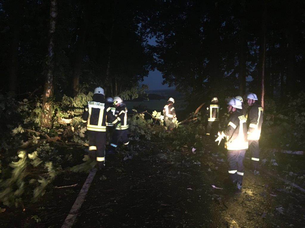Nach einem kurzen, aber sehr heftigen Unwetter wurden wir zur Beseitigung der Schäden alarmiert. Als 1. Einsatz fuhr unser TSF-W nach Höckendorf, wo ein Baum auf ein Haus gestürzt sein soll. Dies bestätigte sich nicht. Ein großer Baum stürzte um und riss Strom- und Telefonkabel mit herunter. Da die Polizei bereits am Einsatzort war und für uns kein Handlungsbedarf bestand, konnten wir die Einsatzstelle übergeben und zurück nach Großnaundorf fahren. Am Gerätehaus angekommen machten wir uns an eine kurze Lagebesprechung und arbeiteten Stück für Stück alle anfallenden Einsätze ab. Insgesamt arbeiteten wir bis in die Nacht herein 10 Einsatzstellen ab, bei denen jeweils Bäume beseitigt werden mussten.