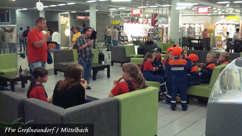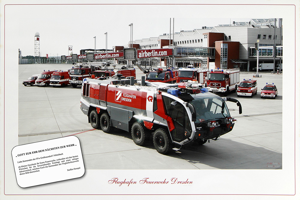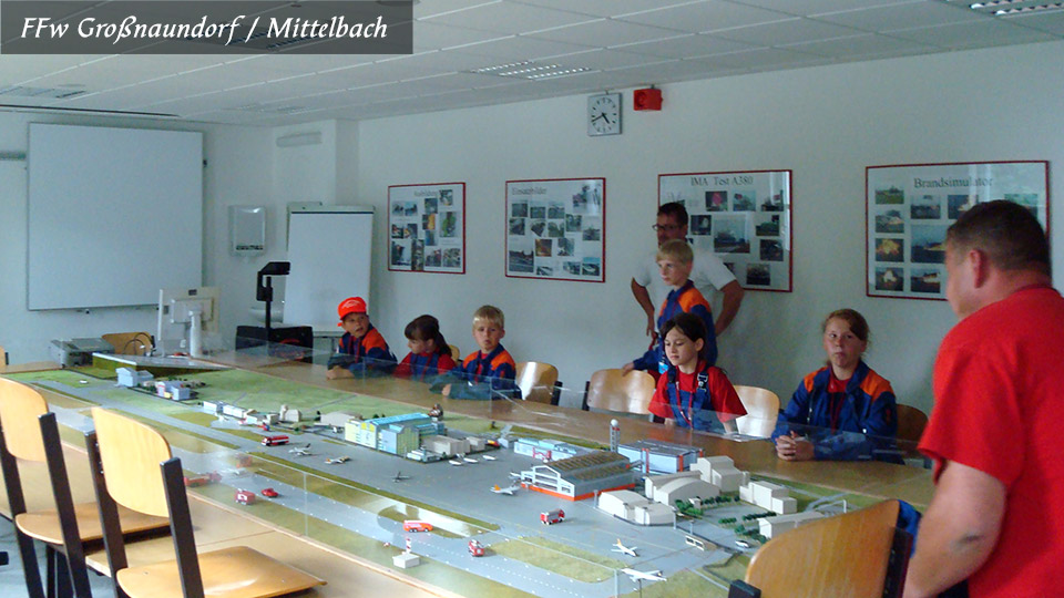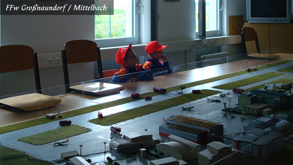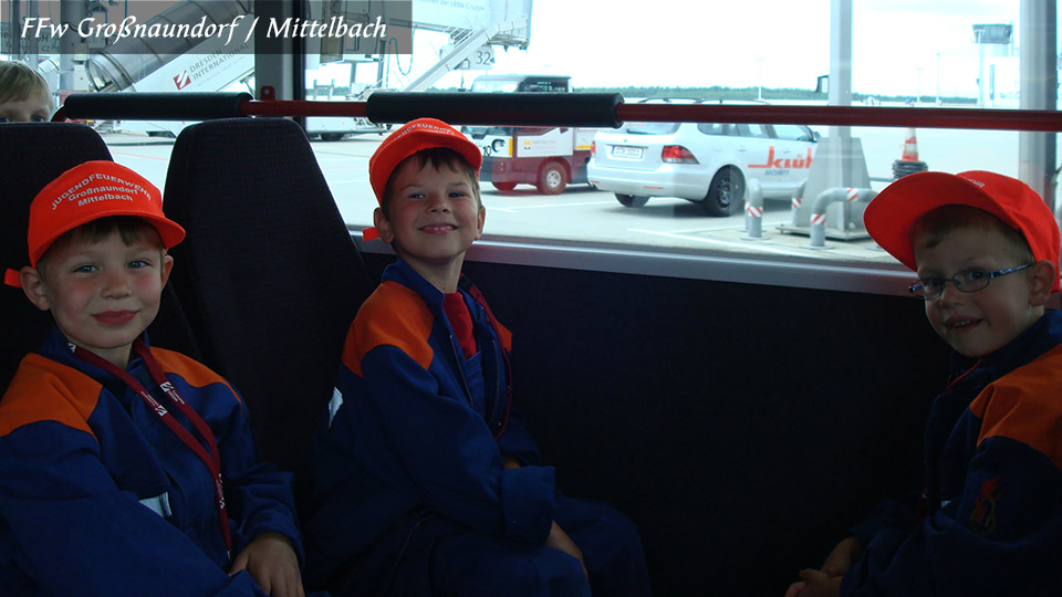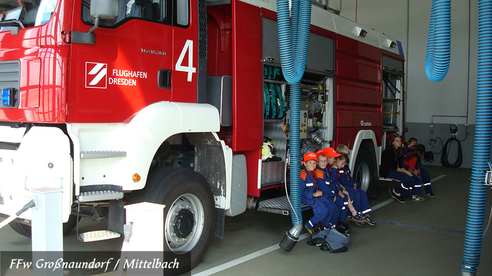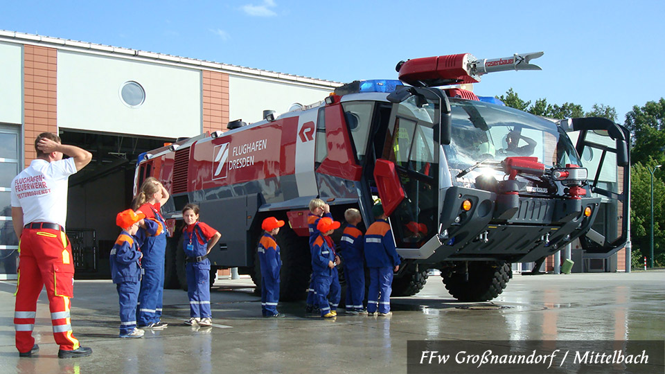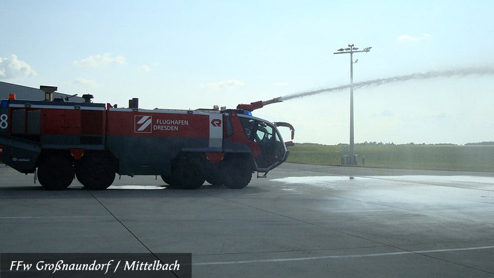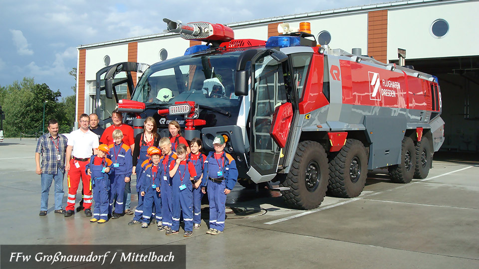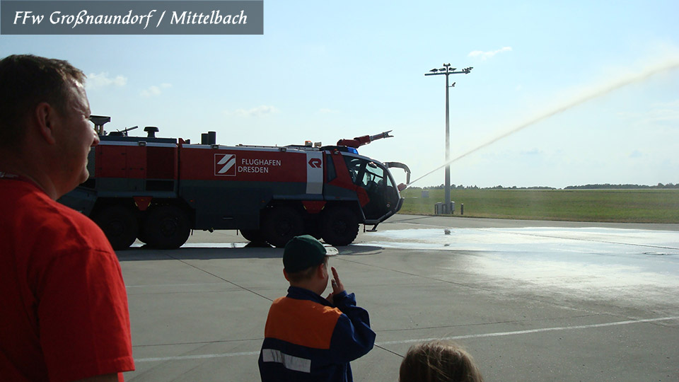 Am Freitag den 12. Juli 2013 besuchte die Jugendfeuerwehr Großnaundorf/Mittelbach die Werksfeuerwehr des Flughafens Dresden. Als Überraschungsausflug vor den Sommerferien ging es um 16:00 Uhr mit 2 Fahrzeugen los ins Unbekannte. Keines der Kinder wusste wohin es ging. Am Flughafen angekommen holte uns der Wachabteilungsleiter mit dem ELW im Terminal ab. Jeder bekam einen Besucherausweis und musste durch die Personenkontrolle. Dann ging es los mit einem Bus Richtung Feuerwache. Angekommen an der Feuerwache begrüßte uns ein Kollege der an diesem Tag im Rettungsdienst eingeteilt war und der uns die Wache zeigen wollte. Der erste Weg führte uns in den großen Schulungsraum in dem eine Modellbauplatte des gesamten Flughafengeländes ist. An dieser Platte wurde uns erklärt wie groß der Flughafen überhaupt ist und das die Feuerwehr innerhalb von 3 Minuten an jeder Stelle des Flughafengeländes sein muss! Danach ging es in die riesige Fahrzeughalle wo uns jedes Fahrzeug einzeln erklärt wurde. Angefangen von kleinem ELW über den „normalen“ Rüstwagen bis hin zu den gigantischen Flugfeldlöschfahrzeugen die über 10 000l Wasser mit sich führen. Bevor die Führung zum Ende kam wurde uns so ein riesiges Löschfahrzeug in Aktion gezeigt. Innerhalb weniger Sekunden gab dieses Fahrzeug mehrere 100l Wasser ab… Am Schluss brachte uns der Wachabteilungsleiter wieder zurück ins Terminal wo es für jeden noch ein Eis gab. Bedanken möchte ich mich bei der Portground GmbH für die Bereitstellung eines Buses und natürlich bei unserem Wehrleiter Dieter Grabke der den ganzen Ausflug organisierte und uns mit dem Bus auf dem Flughafengelände herum fuhr!