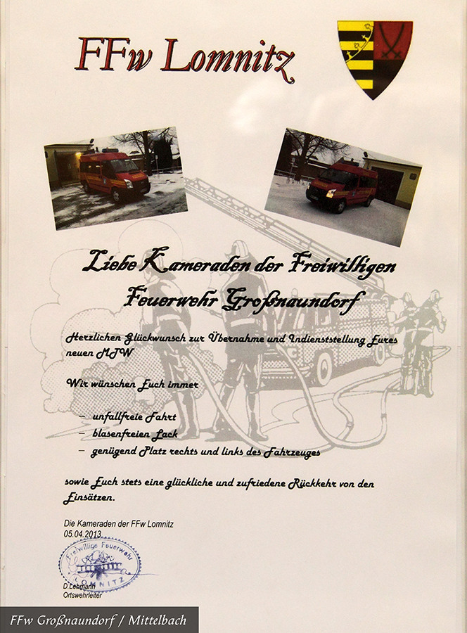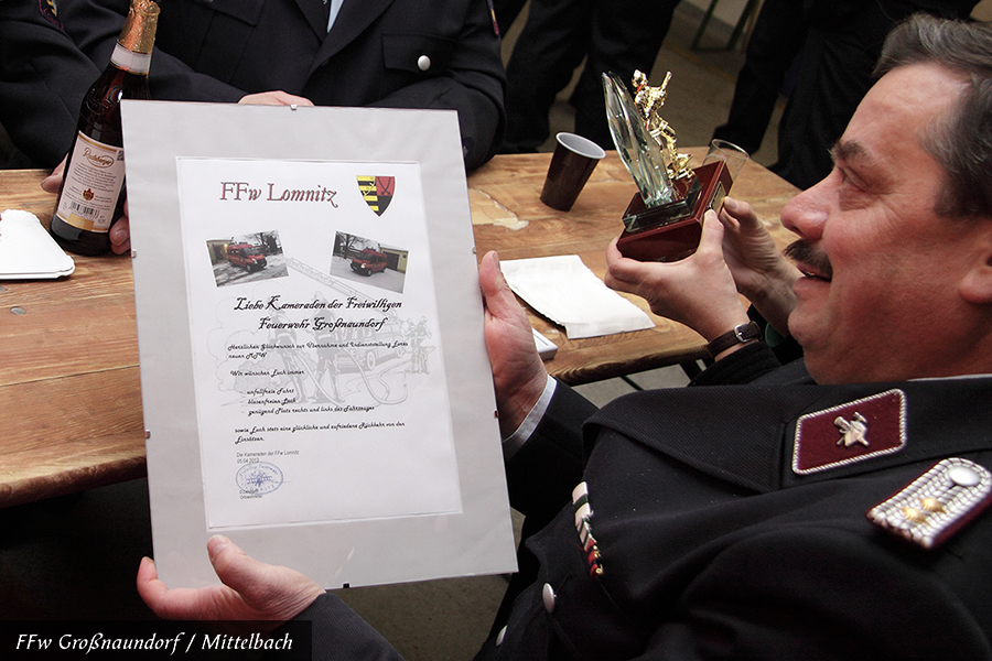 Wir möchten uns an dieser Stelle für das rege Interesse an unserer Arbeit und für die vielseitigen Würdigungen unserer Tätigkeit in der Freiwilligen Feuerwehr von Großnaundorf und Mittelbach bedanken, welche uns bei dieser Festlichkeit wieder entgegengebracht wurden.