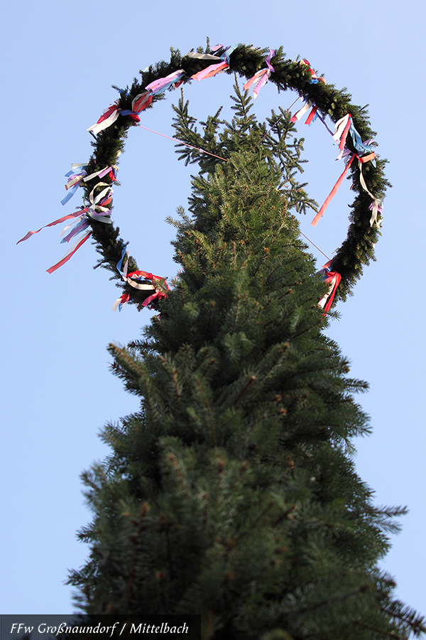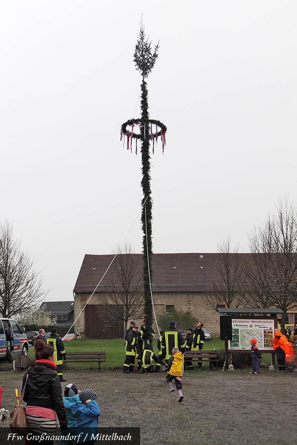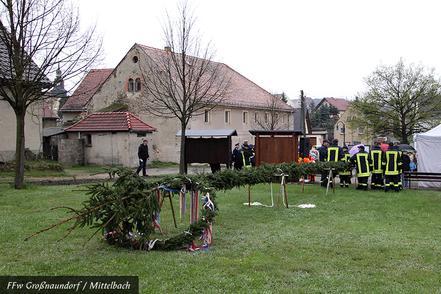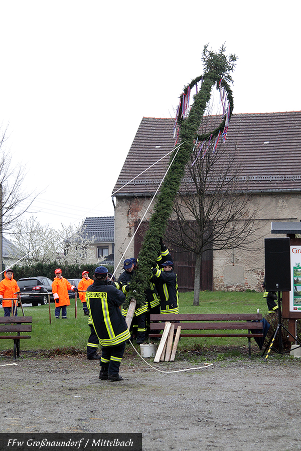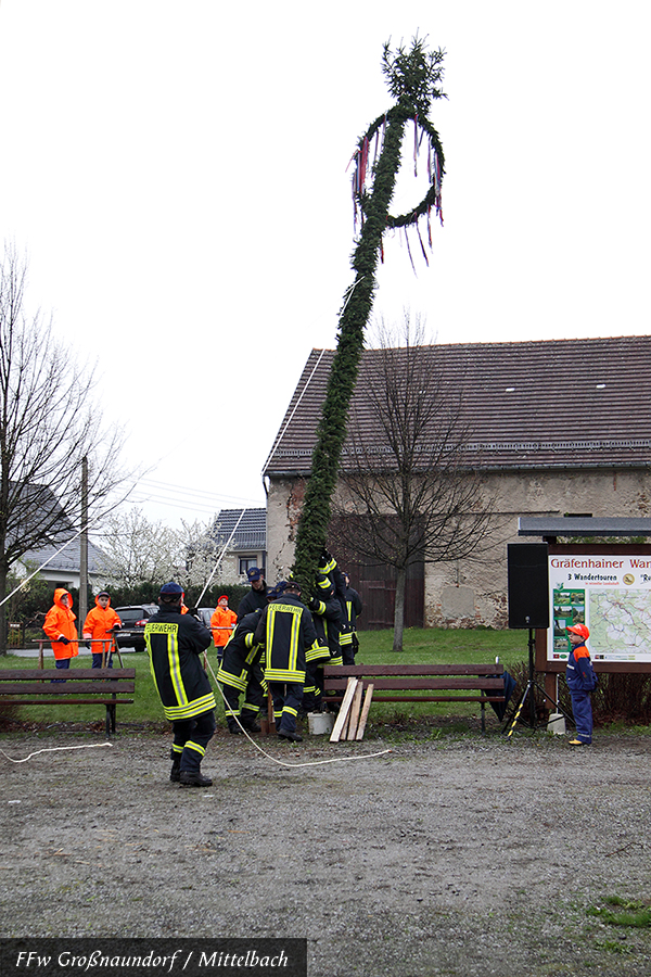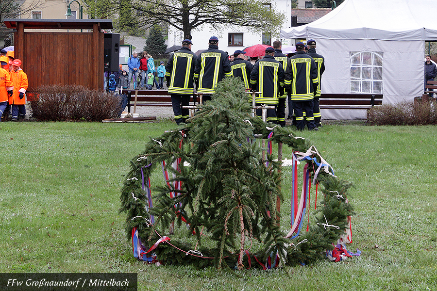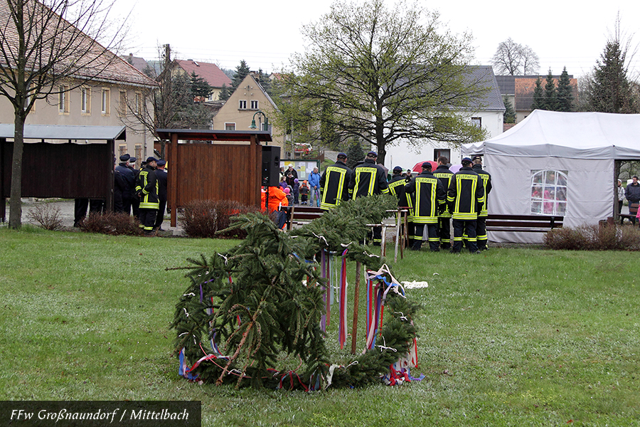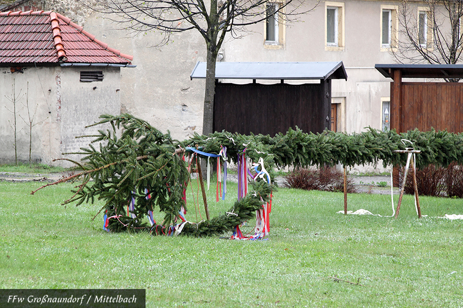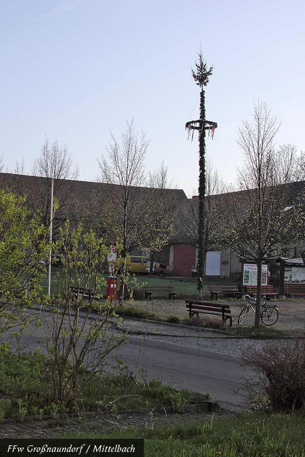 Am Sonntag, den 30.04.2017 richtete die Freiwillige Feuerwehr Großnaundorf / Mittelbach das traditionelle Maibaumstellen und das Hexenfeuer aus. Das Maibaumstellen verlief allerdings nicht ganz ohne Komplikationen. Nach dem Stellen und Befestigen des Baumes brach, nach nur kurzer Standzeit, die Spitze des Maibaums ab. Birke und Kranz hingen am Maibaum und drohten nach unten zu stürzen. Die Kameraden ließen sich nicht lumpen und legten den Baum nach Beendigung des offiziellen Teils um. Schnell wurde Werkzeug herbeigeschafft und die Spitze repariert. Mit neuem Schwung wurde der Maibaum aufgerichtet - diesmal ohne Zwischenfall. Auf dem Schulhof wurden derweil die Gäste mit allem versorgt was das Herz begehrt. Bei Einbruch der Dunkelheit wurde ein Lampionumzug durch Großnaundorf durchgeführt, der am Hexenhaufen hinter dem Freibad endete. Die Fackeln entzündeten den Haufen, die Hexe hielt in diesem Jahr dank der Anfachung durch den Wind auch nicht lange stand. Bis in die Nacht wurde im Zelt getanzt, getrunken und gegessen.