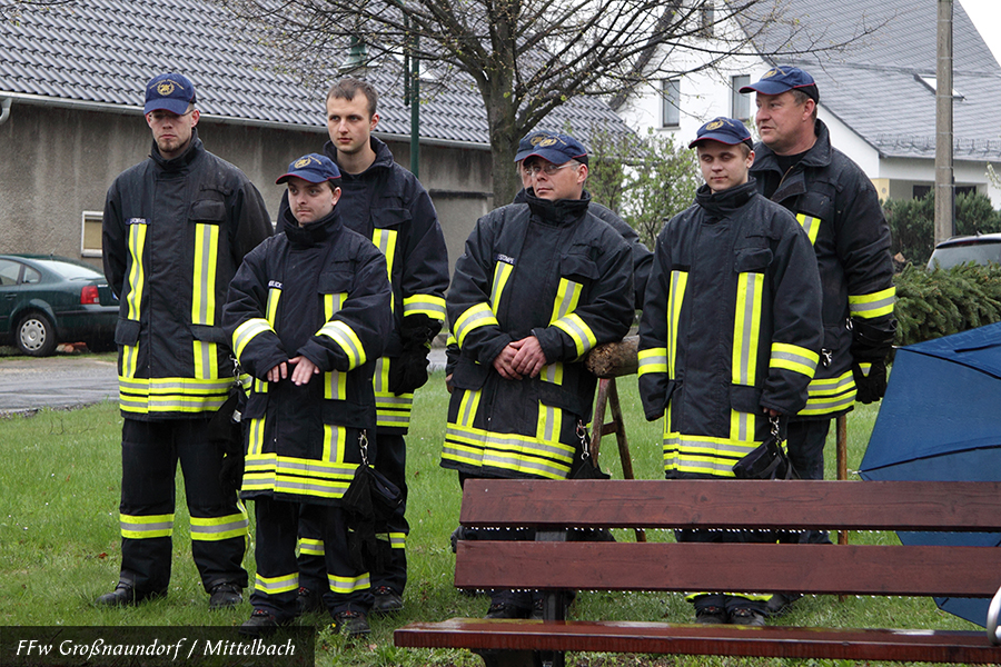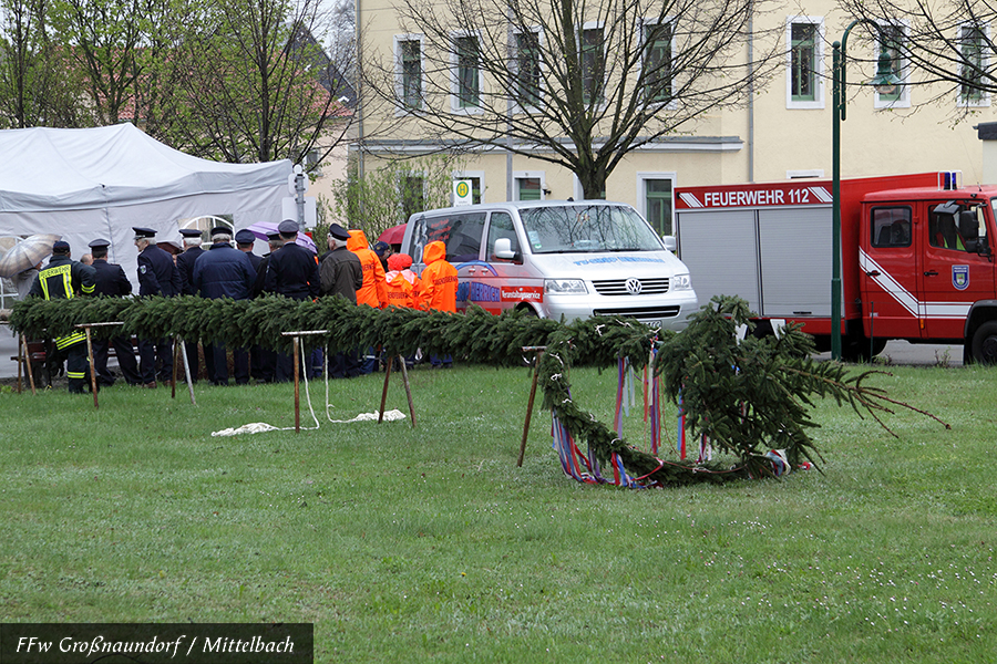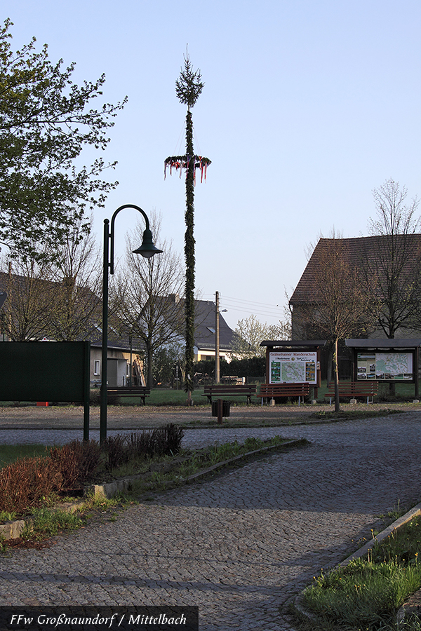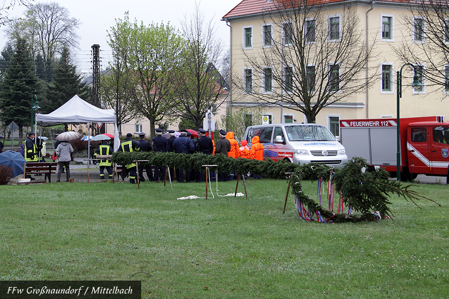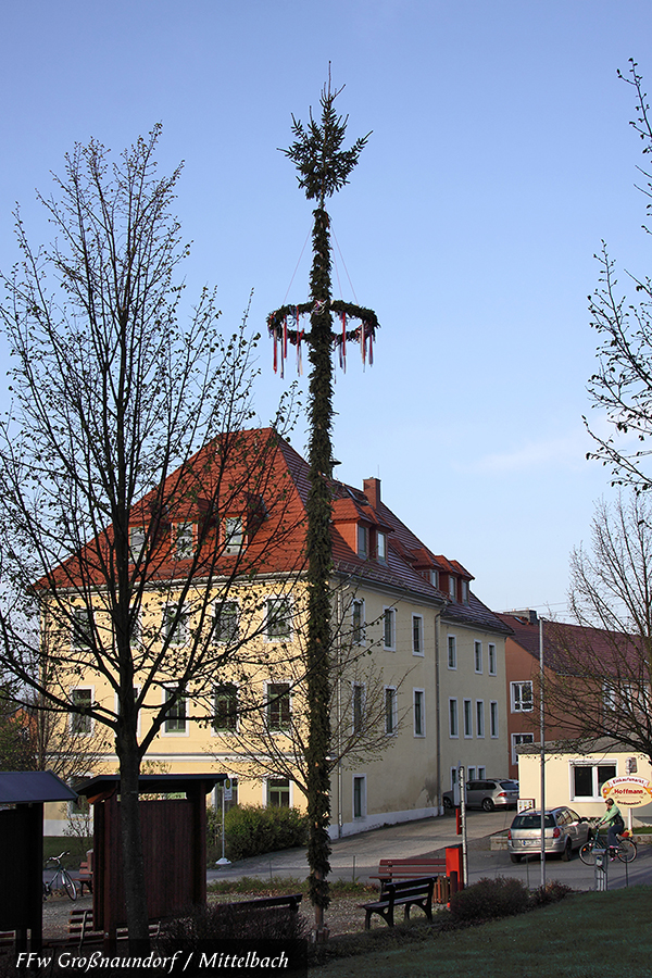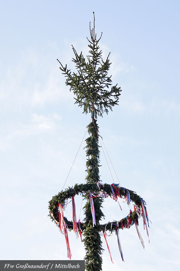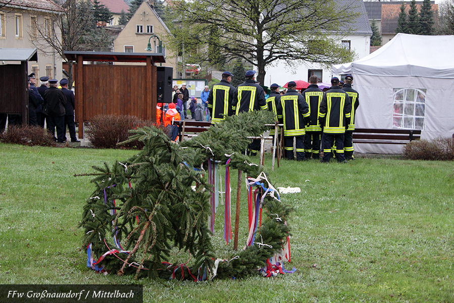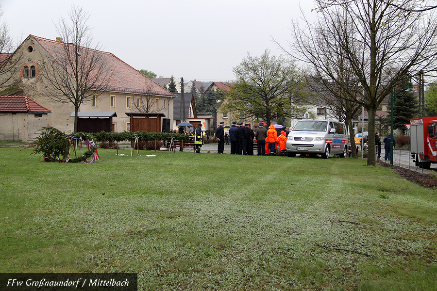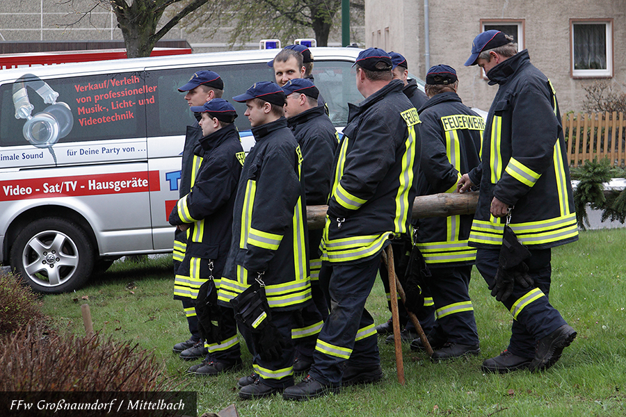 Am Sonntag, den 30.04.2017 richtete die Freiwillige Feuerwehr Großnaundorf / Mittelbach das traditionelle Maibaumstellen und das Hexenfeuer aus. Das Maibaumstellen verlief allerdings nicht ganz ohne Komplikationen. Nach dem Stellen und Befestigen des Baumes brach, nach nur kurzer Standzeit, die Spitze des Maibaums ab. Birke und Kranz hingen am Maibaum und drohten nach unten zu stürzen. Die Kameraden ließen sich nicht lumpen und legten den Baum nach Beendigung des offiziellen Teils um. Schnell wurde Werkzeug herbeigeschafft und die Spitze repariert. Mit neuem Schwung wurde der Maibaum aufgerichtet - diesmal ohne Zwischenfall. Auf dem Schulhof wurden derweil die Gäste mit allem versorgt was das Herz begehrt. Bei Einbruch der Dunkelheit wurde ein Lampionumzug durch Großnaundorf durchgeführt, der am Hexenhaufen hinter dem Freibad endete. Die Fackeln entzündeten den Haufen, die Hexe hielt in diesem Jahr dank der Anfachung durch den Wind auch nicht lange stand. Bis in die Nacht wurde im Zelt getanzt, getrunken und gegessen.