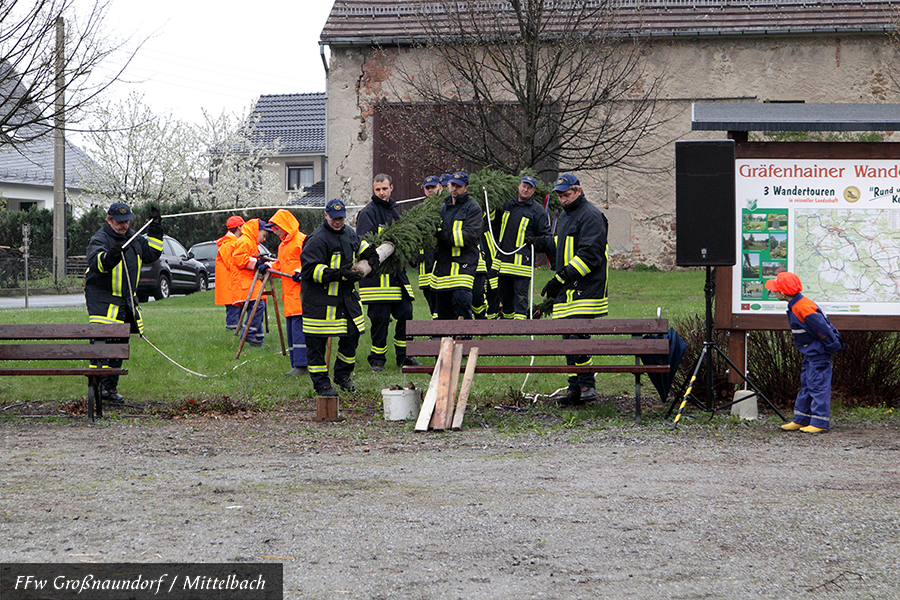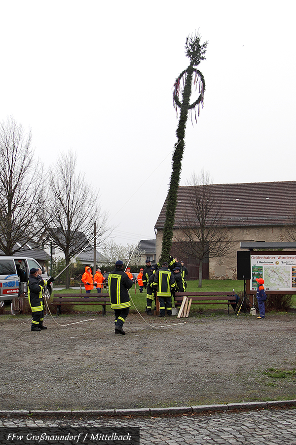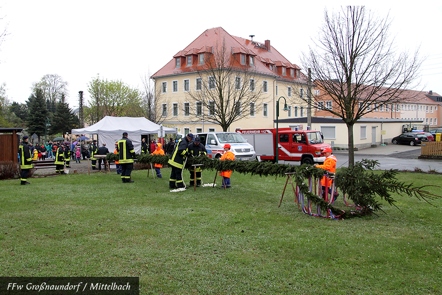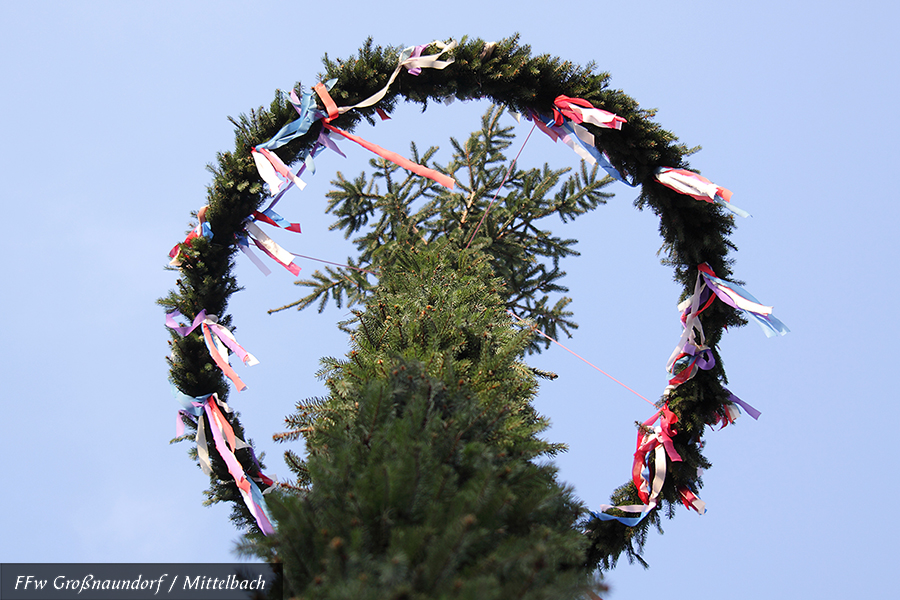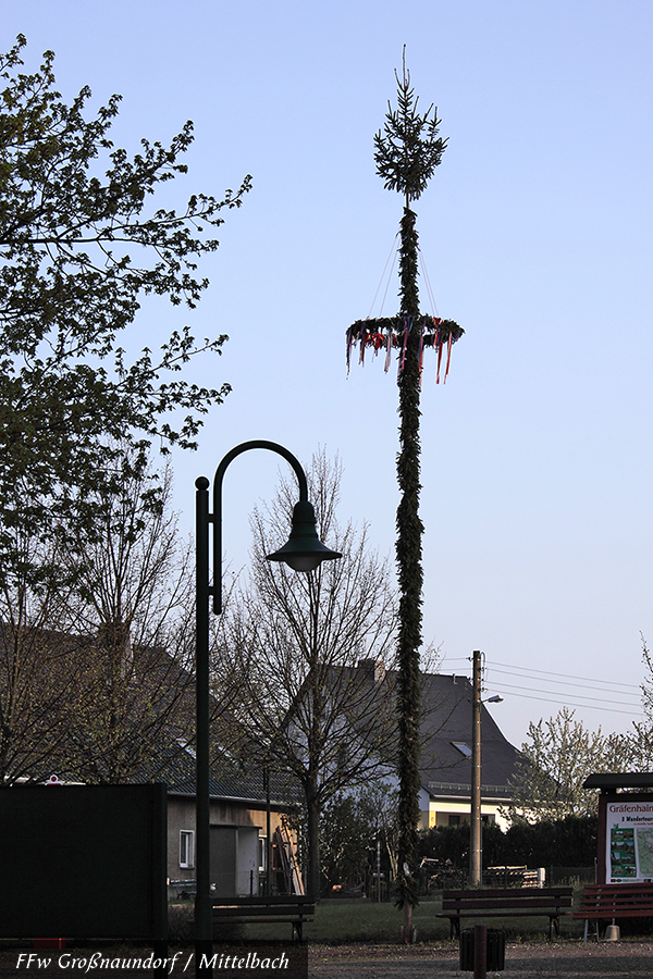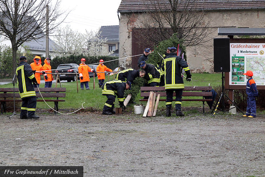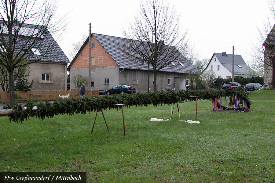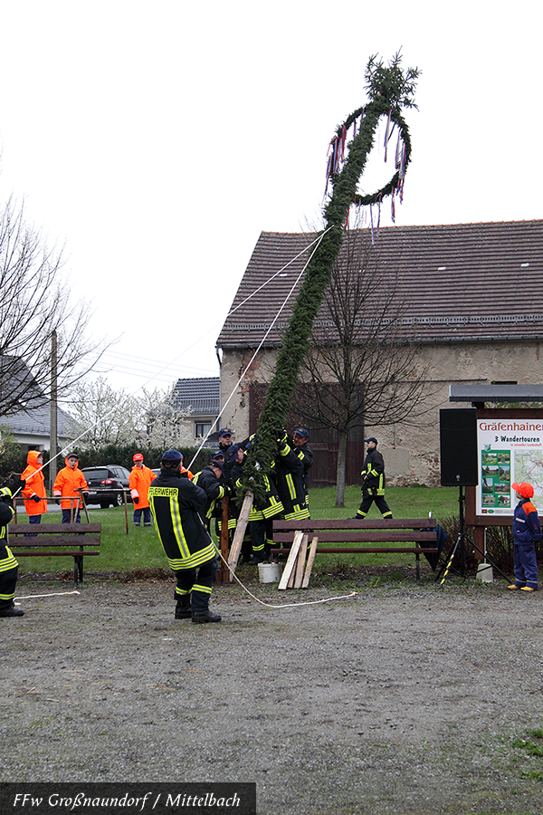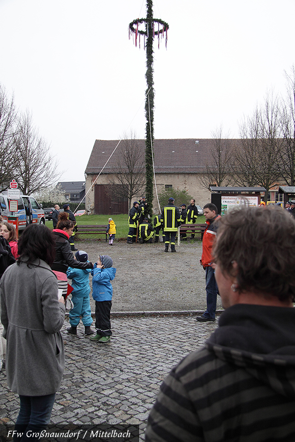 Am Sonntag, den 30.04.2017 richtete die Freiwillige Feuerwehr Großnaundorf / Mittelbach das traditionelle Maibaumstellen und das Hexenfeuer aus. Das Maibaumstellen verlief allerdings nicht ganz ohne Komplikationen. Nach dem Stellen und Befestigen des Baumes brach, nach nur kurzer Standzeit, die Spitze des Maibaums ab. Birke und Kranz hingen am Maibaum und drohten nach unten zu stürzen. Die Kameraden ließen sich nicht lumpen und legten den Baum nach Beendigung des offiziellen Teils um. Schnell wurde Werkzeug herbeigeschafft und die Spitze repariert. Mit neuem Schwung wurde der Maibaum aufgerichtet - diesmal ohne Zwischenfall. Auf dem Schulhof wurden derweil die Gäste mit allem versorgt was das Herz begehrt. Bei Einbruch der Dunkelheit wurde ein Lampionumzug durch Großnaundorf durchgeführt, der am Hexenhaufen hinter dem Freibad endete. Die Fackeln entzündeten den Haufen, die Hexe hielt in diesem Jahr dank der Anfachung durch den Wind auch nicht lange stand. Bis in die Nacht wurde im Zelt getanzt, getrunken und gegessen.