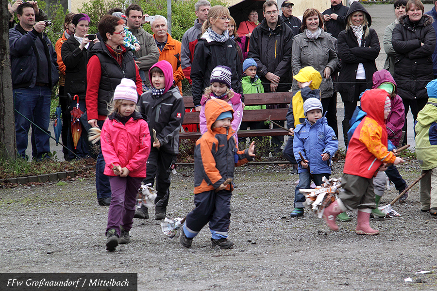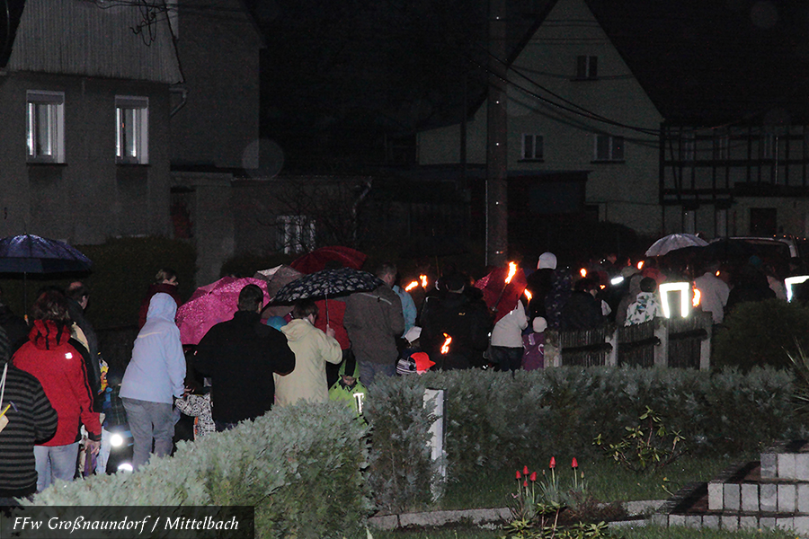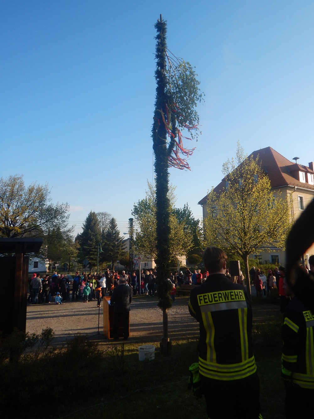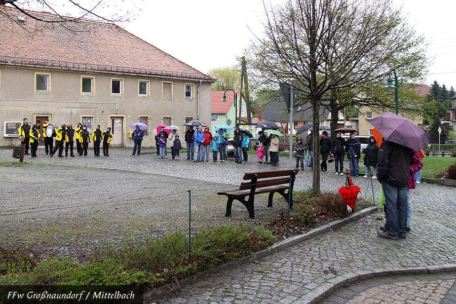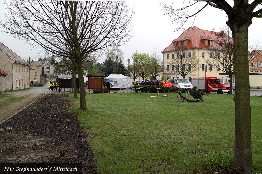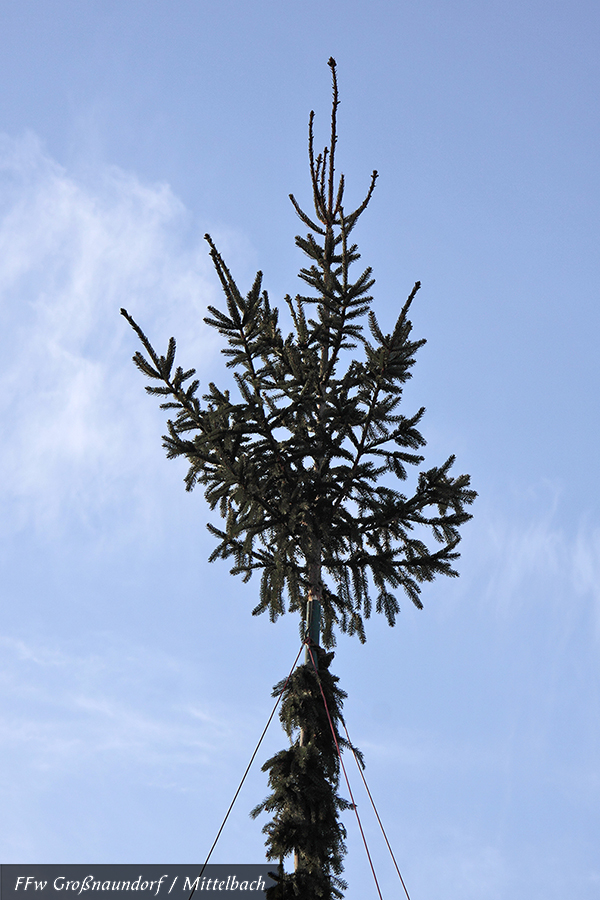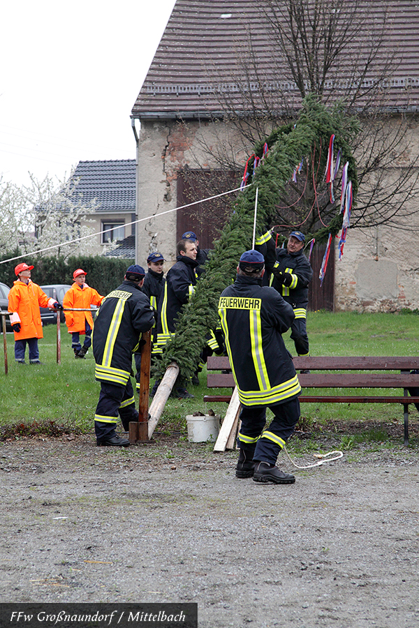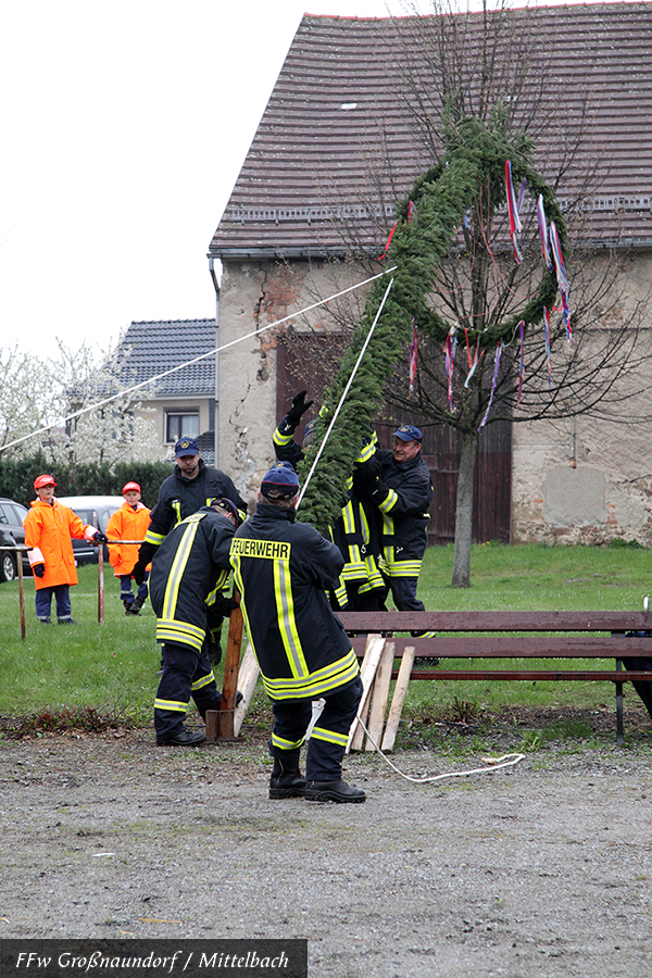 Am Sonntag, den 30.04.2017 richtete die Freiwillige Feuerwehr Großnaundorf / Mittelbach das traditionelle Maibaumstellen und das Hexenfeuer aus. Das Maibaumstellen verlief allerdings nicht ganz ohne Komplikationen. Nach dem Stellen und Befestigen des Baumes brach, nach nur kurzer Standzeit, die Spitze des Maibaums ab. Birke und Kranz hingen am Maibaum und drohten nach unten zu stürzen. Die Kameraden ließen sich nicht lumpen und legten den Baum nach Beendigung des offiziellen Teils um. Schnell wurde Werkzeug herbeigeschafft und die Spitze repariert. Mit neuem Schwung wurde der Maibaum aufgerichtet - diesmal ohne Zwischenfall. Auf dem Schulhof wurden derweil die Gäste mit allem versorgt was das Herz begehrt. Bei Einbruch der Dunkelheit wurde ein Lampionumzug durch Großnaundorf durchgeführt, der am Hexenhaufen hinter dem Freibad endete. Die Fackeln entzündeten den Haufen, die Hexe hielt in diesem Jahr dank der Anfachung durch den Wind auch nicht lange stand. Bis in die Nacht wurde im Zelt getanzt, getrunken und gegessen.