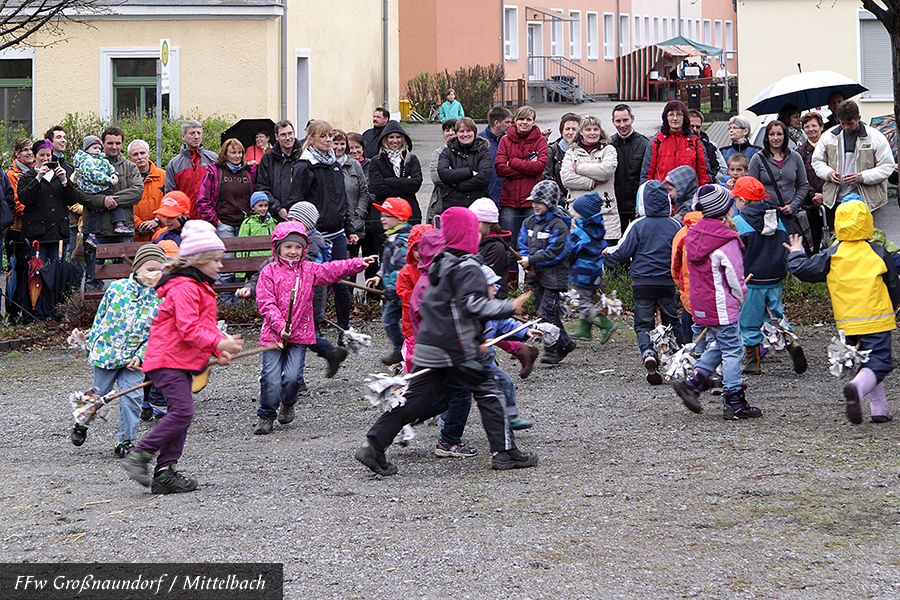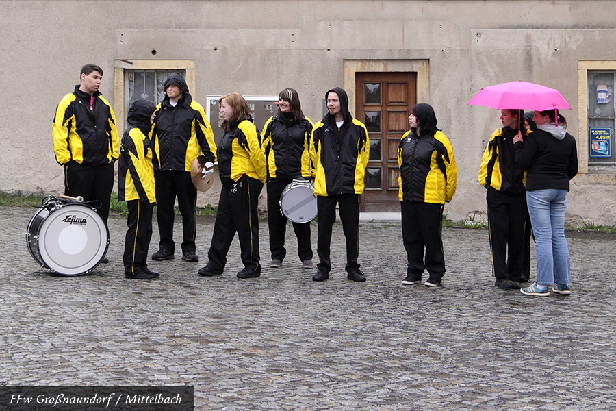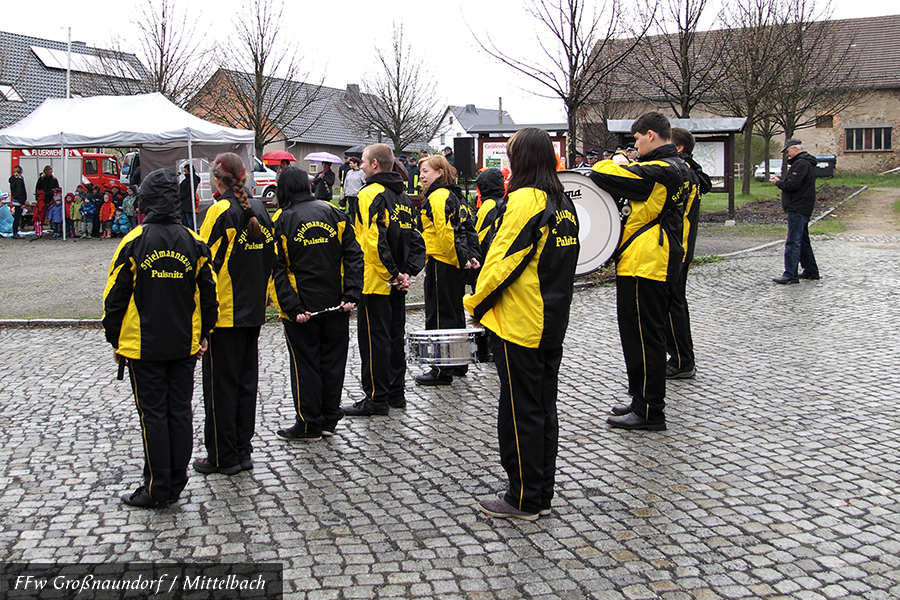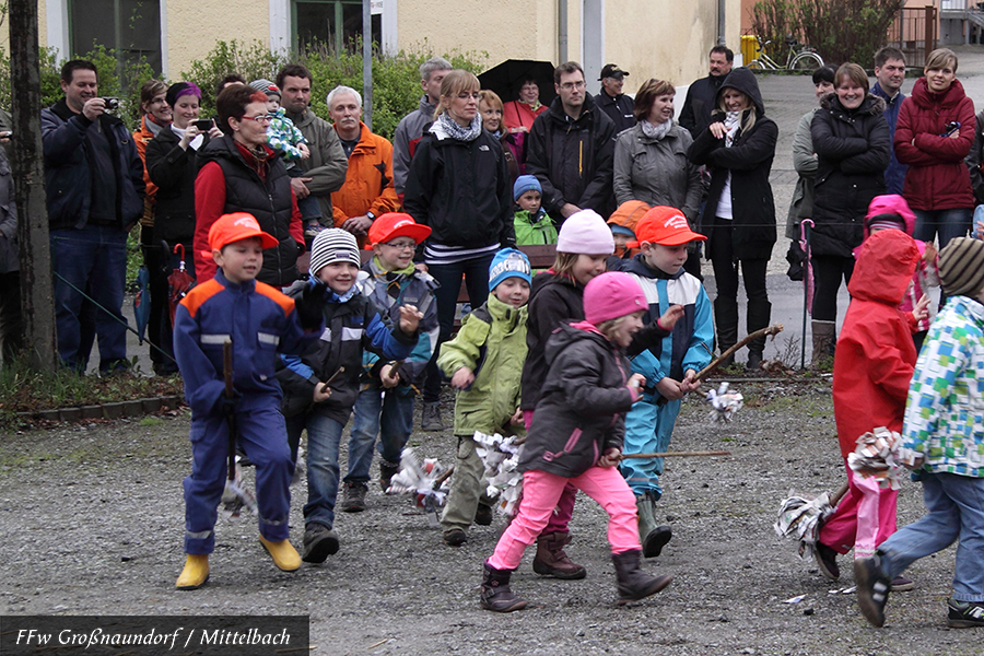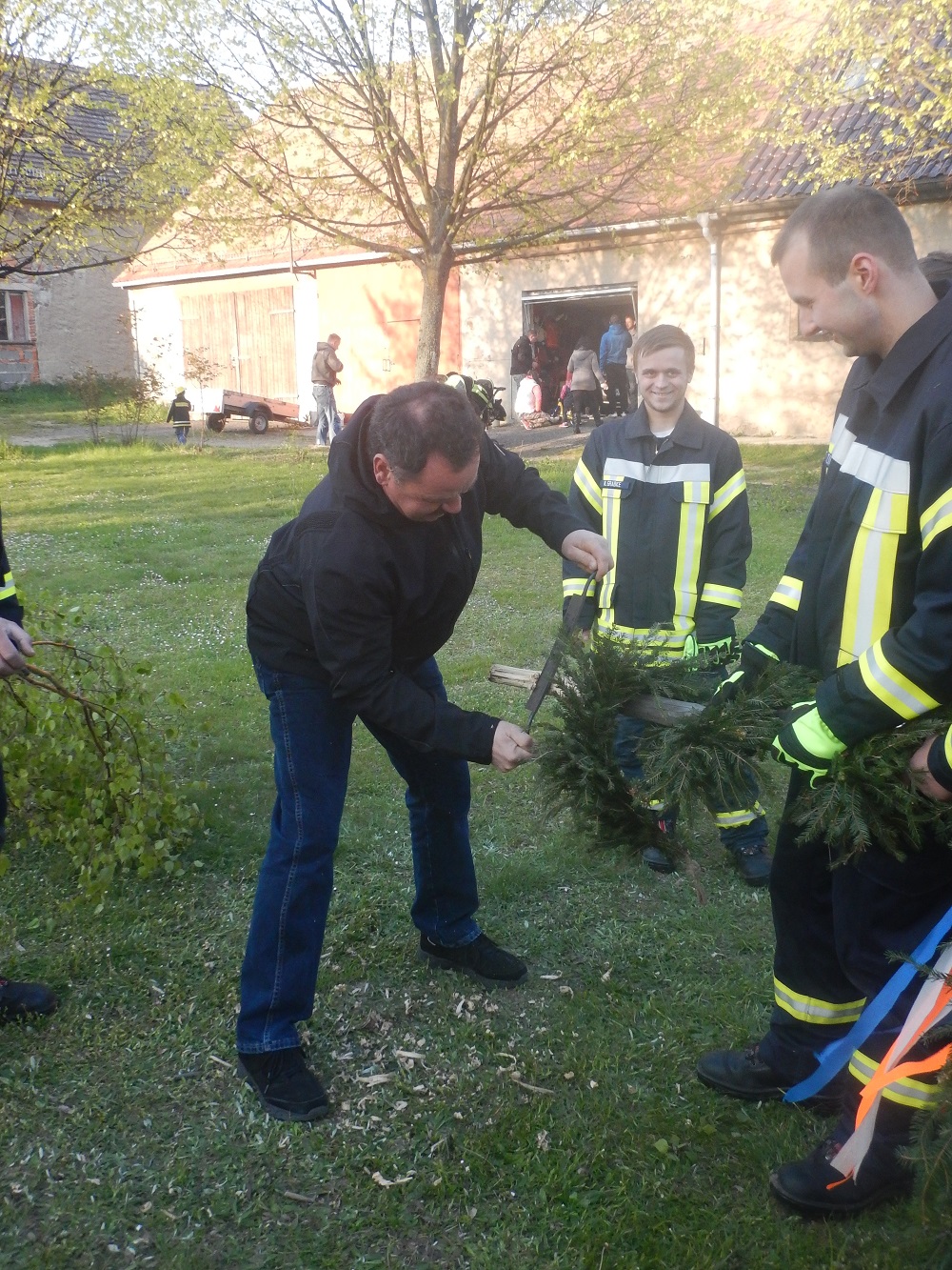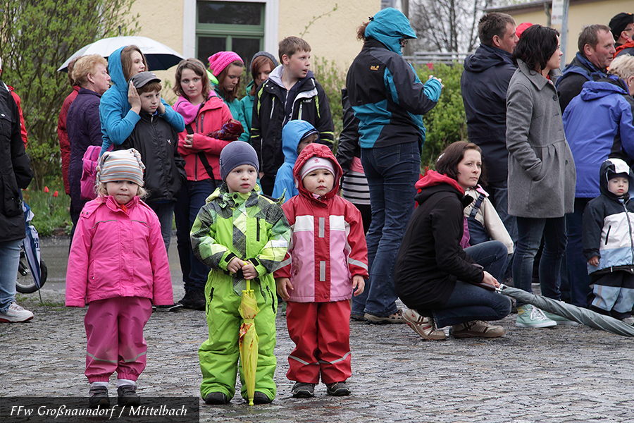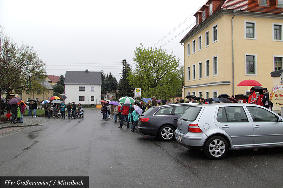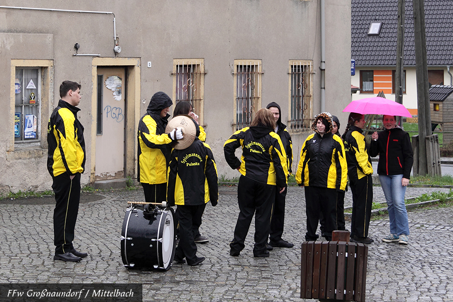 Am Sonntag, den 30.04.2017 richtete die Freiwillige Feuerwehr Großnaundorf / Mittelbach das traditionelle Maibaumstellen und das Hexenfeuer aus. Das Maibaumstellen verlief allerdings nicht ganz ohne Komplikationen. Nach dem Stellen und Befestigen des Baumes brach, nach nur kurzer Standzeit, die Spitze des Maibaums ab. Birke und Kranz hingen am Maibaum und drohten nach unten zu stürzen. Die Kameraden ließen sich nicht lumpen und legten den Baum nach Beendigung des offiziellen Teils um. Schnell wurde Werkzeug herbeigeschafft und die Spitze repariert. Mit neuem Schwung wurde der Maibaum aufgerichtet - diesmal ohne Zwischenfall. Auf dem Schulhof wurden derweil die Gäste mit allem versorgt was das Herz begehrt. Bei Einbruch der Dunkelheit wurde ein Lampionumzug durch Großnaundorf durchgeführt, der am Hexenhaufen hinter dem Freibad endete. Die Fackeln entzündeten den Haufen, die Hexe hielt in diesem Jahr dank der Anfachung durch den Wind auch nicht lange stand. Bis in die Nacht wurde im Zelt getanzt, getrunken und gegessen.