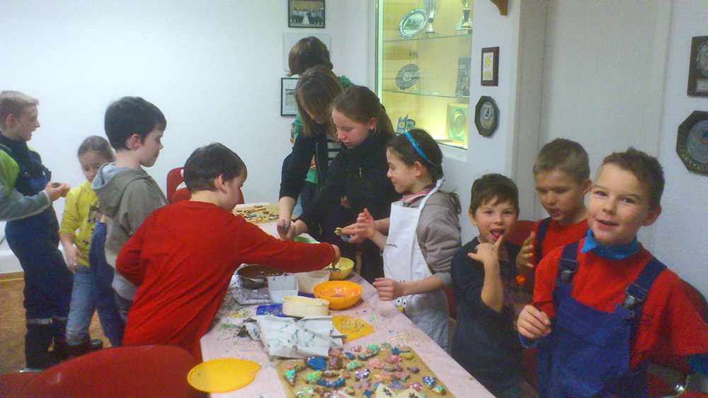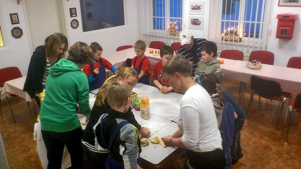 Zu unserem letzten Dienst im Jahr 2012 trafen wir uns im Schulungsraum zum gemeinsamen Plätzchen backen. Mit Hilfe einer Mutti und viel Tatendrang machten wir uns ans Werk … Zuerst musste der Teig geknetet und ausgerollt werden, dann wurden die verschiedensten Figuren aus dem Teig ausgestochen und auf einem Blech zum backen gesammelt. Spätestens jetzt hatte keines der Kinder mehr saubere Sachen an, jeder hatte irgendwo Mehlstaub, ja sogar in den Haaren.